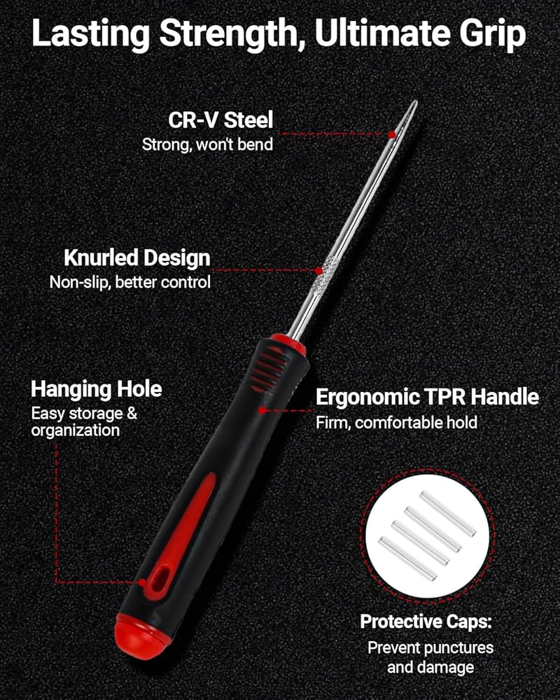 Feature: Multi-angle hooks for various precision tasks, high-strength steel construction, anti-slip knurled shaft & ergonomic handle.
