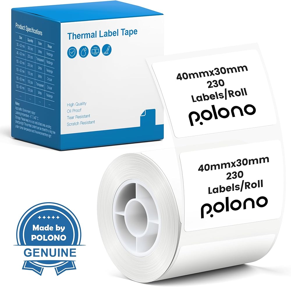 【Specifications】Label Size: 1.57"x1.18" (40x30mm). Quantity: 1 Roll, 230 labels. Color: White. Easy to peel off, Permanent-Adhesive. This thermal label is perfect fit for POLONO PM220S label maker, making your own stickers for any occasion