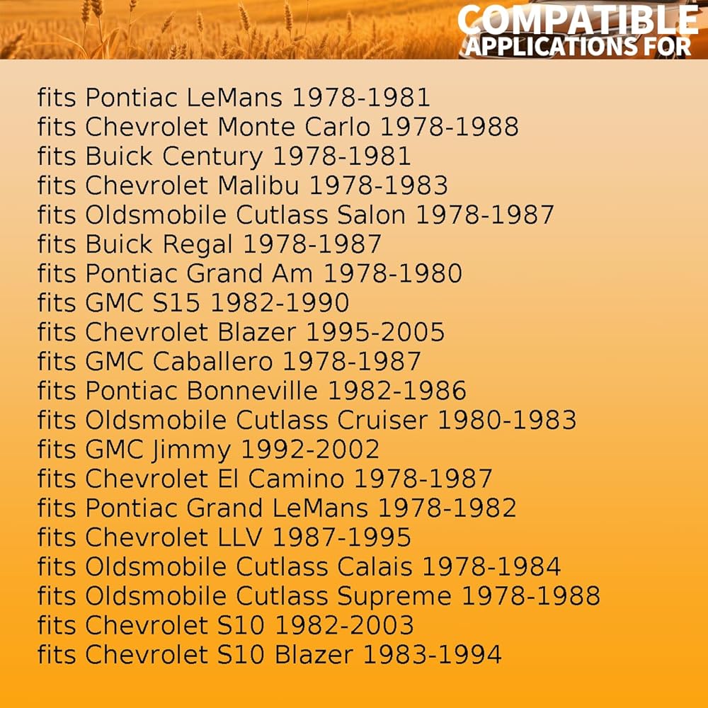 Fitment2: Suspension Control Arm Shaft Kit fits GMC Sonoma 1991-2003 fits Isuzu Hombre 1996-2000 fits Oldsmobile Cutlass 1978-1987 fits Oldsmobile Cutlass Calais 1978-1984 fits Oldsmobile Cutlass Cruiser 1980-1983 fits Oldsmobile Cutlass Salon 1978-1987 fits Oldsmobile Cutlass Supreme 1978-1988 fits Pontiac Bonneville 1982-1986 fits Pontiac Grand Am 1978-1980 fits Pontiac Grand LeMans 1978-1982 fits Pontiac Grand Prix 1978-1987