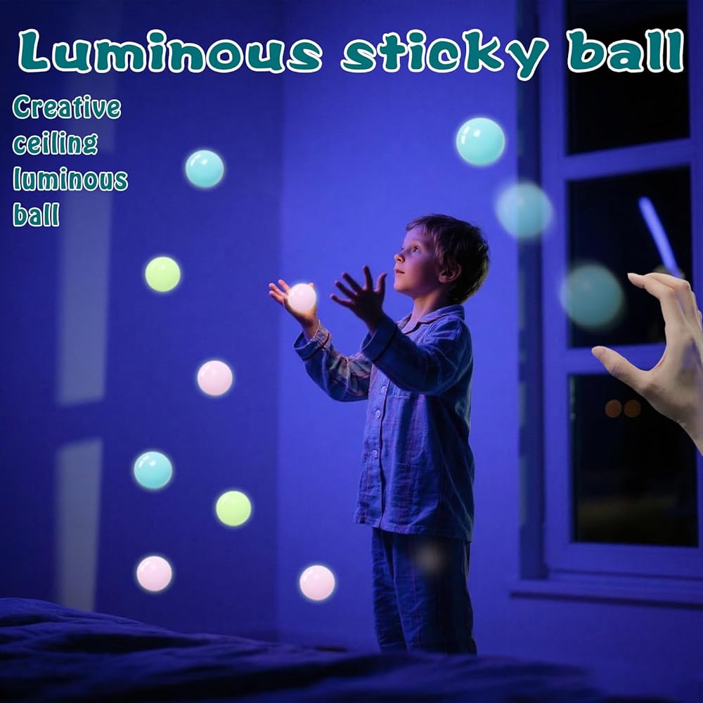 【Repeated Use】This sticky balls that glows in the dark has super stickiness and can stick to the ceiling or wall. If you find that the sticky ball is dirty, or the surface viscosity drops, you can wash the ball surface with clean water, and the viscosity will recover.