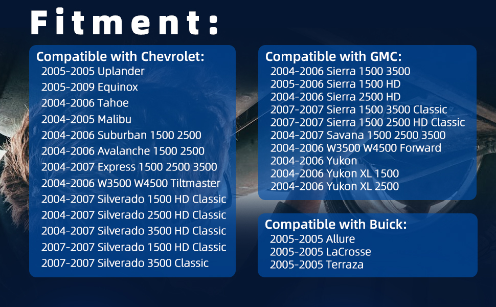 Fitment 1: Compatible with Chevrolet: Uplander, Equinox, Tahoe, Malibu, Suburban 1500 2500, Avalanche 1500 2500, Express 1500 2500 3500, W3500 W4500 Tiltmaster, Silverado 1500 2500 3500 HD Classic, Silverado 1500 HD Classic, Silverado 3500 Classic; Cadillac: Seville, STS, XLR, DeVille, SRX, Escalade ESV/EXT
