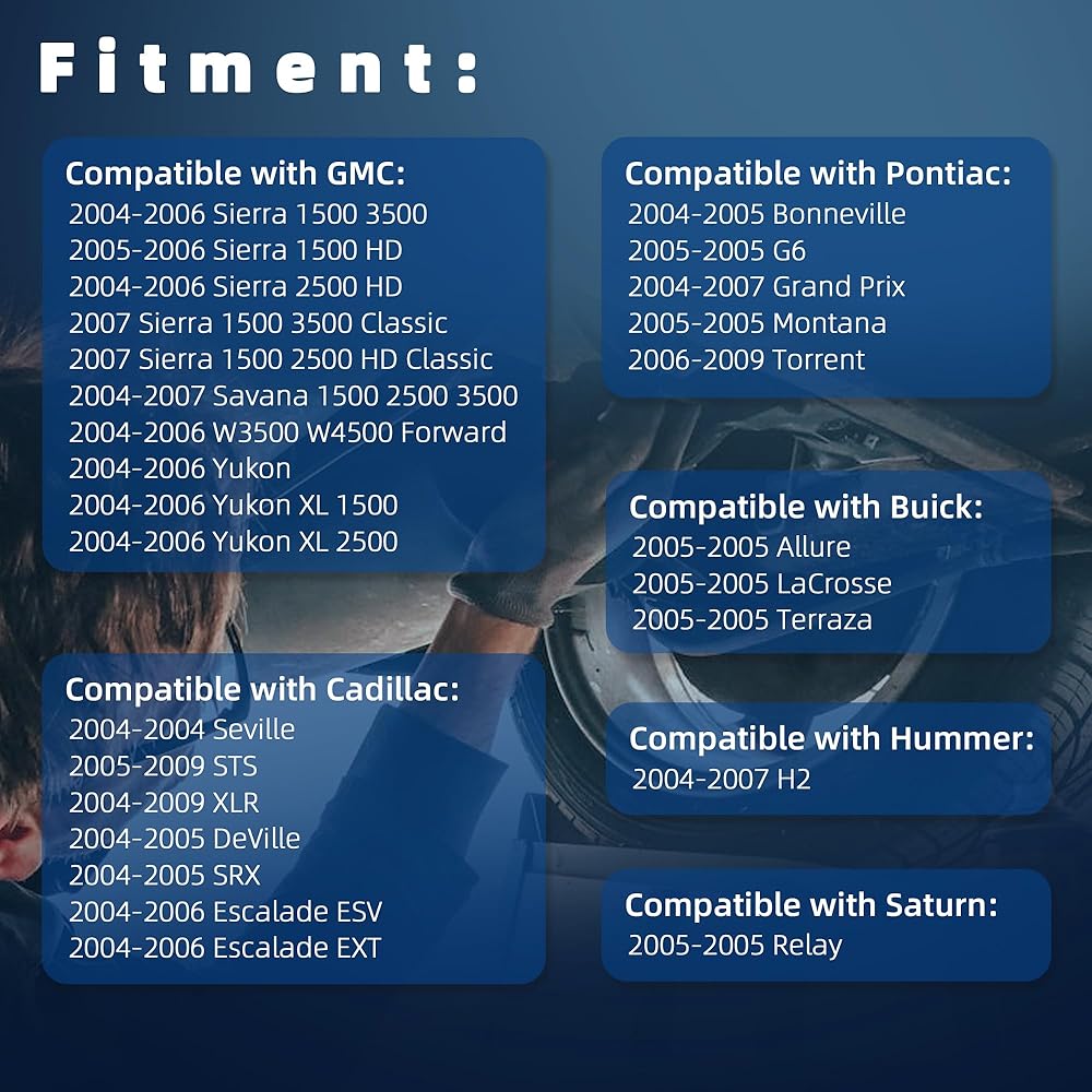 Fitment 2: Compatible with GMC: Sierra 1500 3500, Sierra 1500 HD, Sierra 2500 HD, Sierra 1500 3500 Classic, Sierra 1500 2500 HD Classic, Savana 1500 2500 3500, W3500 W4500 Forward, Yukon, Yukon XL 1500 2500; Hummer: H2; Saturn: Relay; Buick: Allure, LaCrosse, Terraza; Pontiac: Bonneville, G6, Grand Prix, Montana, Torrent