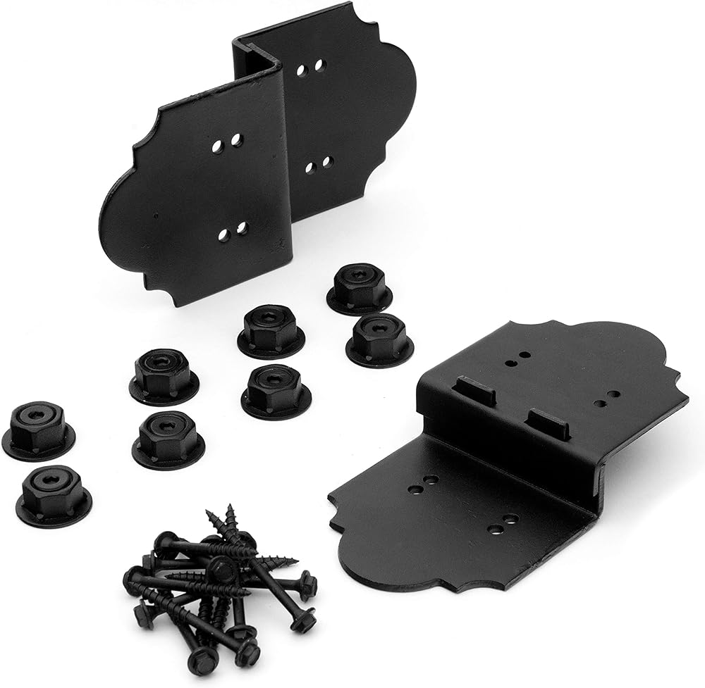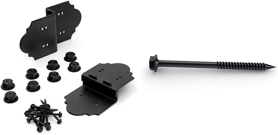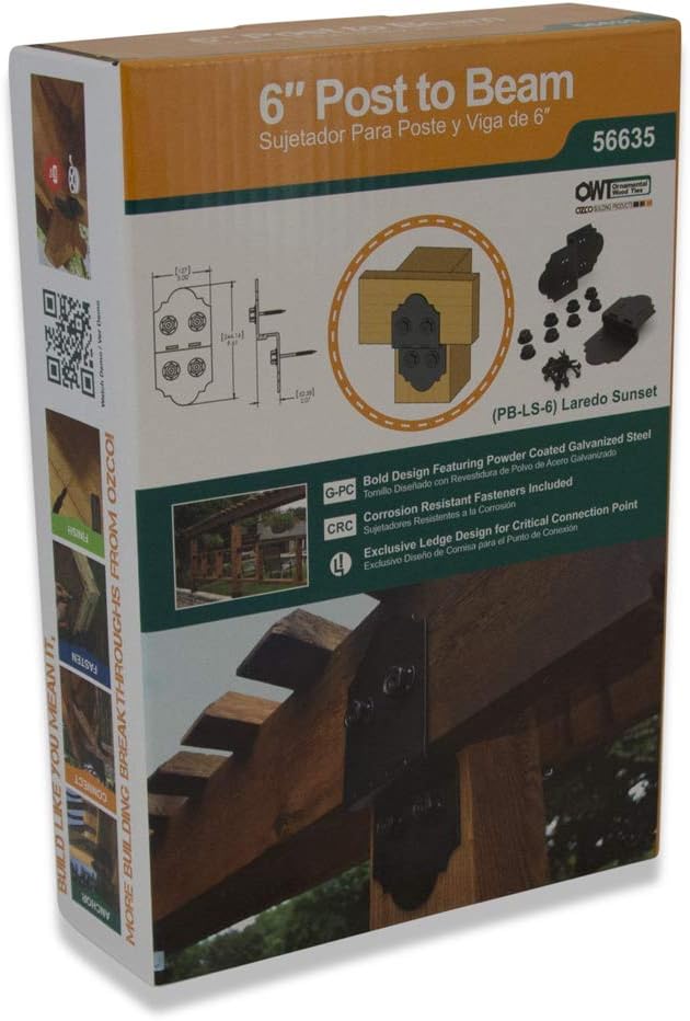 This product bundle includes two complementary items to help with your building and construction projects. The first component is a pack of 2 Laredo Sunset 6-inch post-to-beam connectors made of durable, corrosion-resistant galvanized steel with a black powder coat finish. These revolutionary connectors feature an interlocking top cover plate that adjusts to beam thickness and can be used on smooth or rough-cut wood without pre-drilling. The second component is a pack of 25 heavy-duty 1/4-inch by 3-3/4-inch OWT timber screws with aggressive threads, a sharp point, and a special coating for corrosion resistance and easy penetration without wood splitting. Together, these two component packs provide everything you need to securely connect posts to beams while adding stability and style to your structure. The durable black powder-coated steel post connectors and thick galvanized screws are designed to last, making this bundle ideal for all your building needs.
