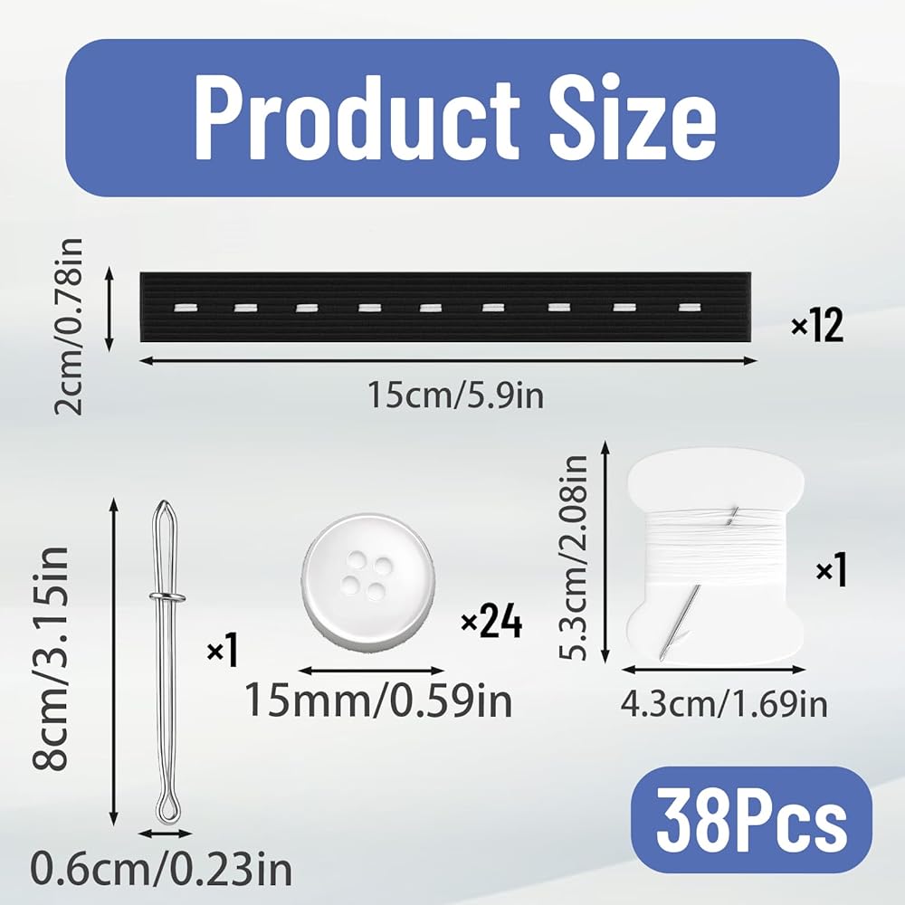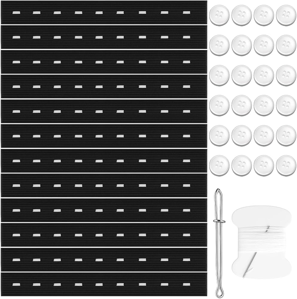 This pant waist tightener helps adjust the waistband of your pants for a better fit; The elastic with button holes provides flexibility and comfort, making it suitable for various waist sizes with elastic 12 black bands 24 clear buttons 1 black needle 1 thread hook