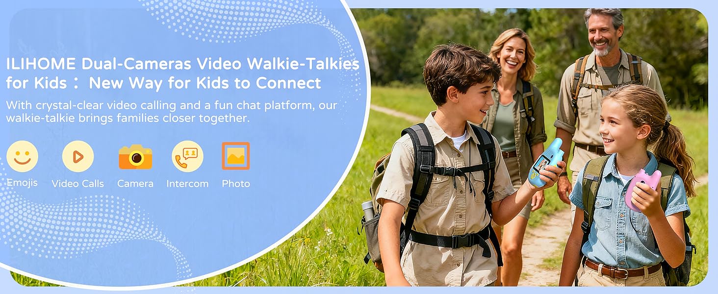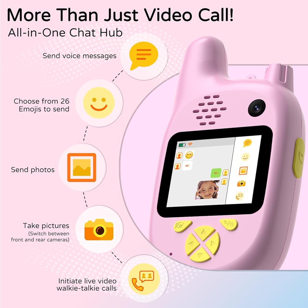 【All-in-One Fun Chat Hub, More Than Just Video Call】:This is their first, safe "social app"! Beyond live video calls, the fun chat interface lets them send voice messages, 26 different emojis, and photos (from gallery or instant camera shots). It's the most feature-rich walkie talkies for kids on the market, designed to keep them connected and creatively engaged for hours.
