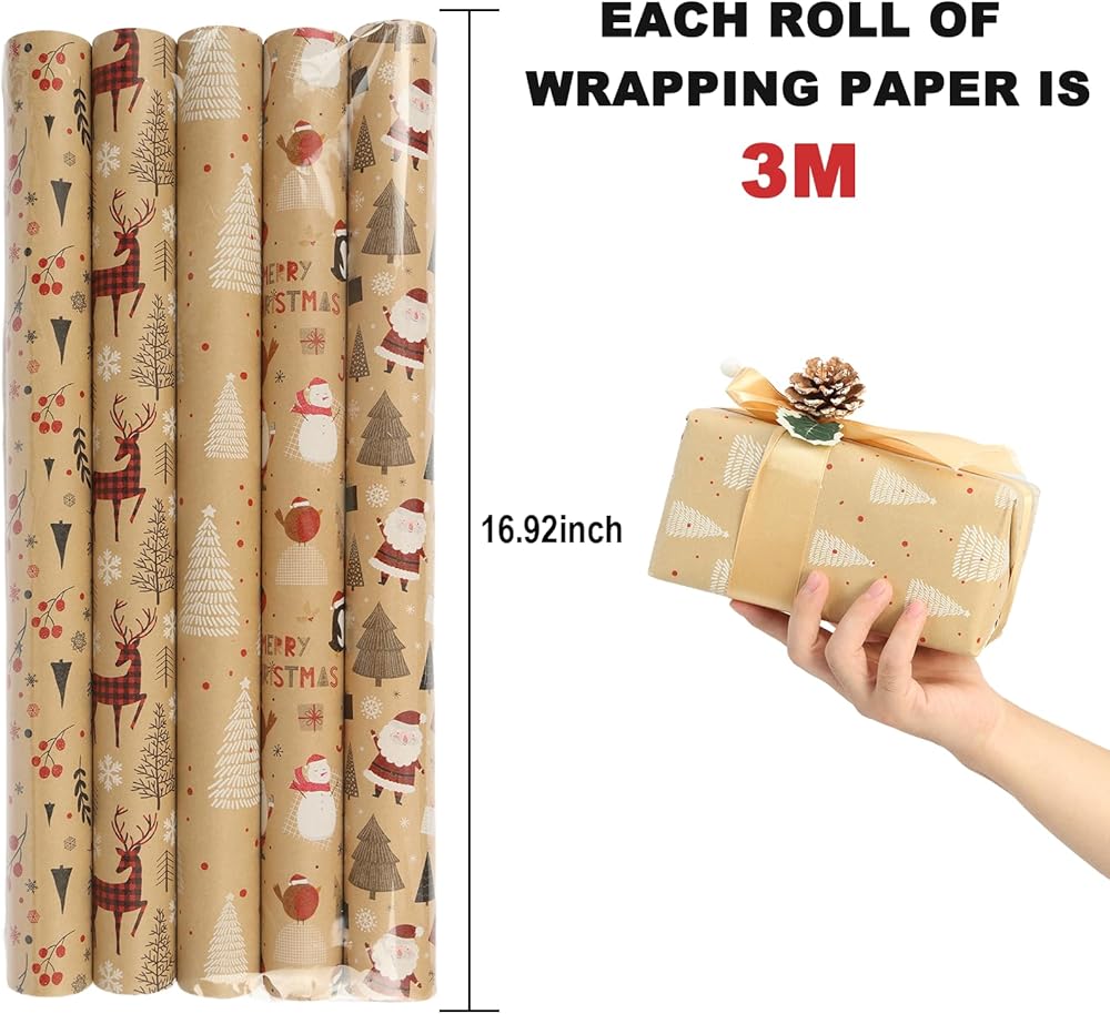 Size: Each roll of Christmas wrapping paper rolls approx 43cm/17inch in wide, 3m/10in long, totally totally 15m/49.2ft long, so you can easily pack most Christmas gifts in many different size.