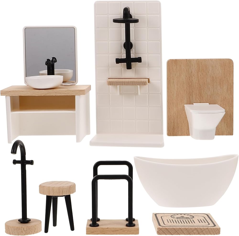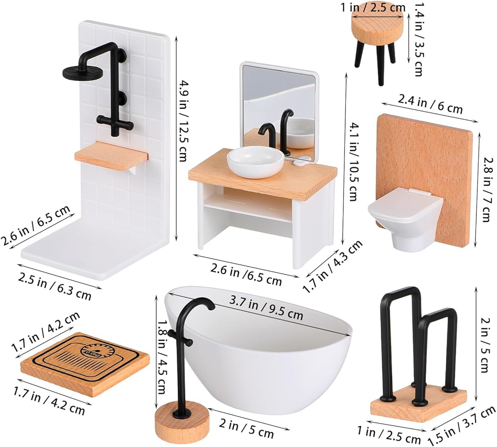 Complete 8-Piece Set: This kit includes 1 shower room, 1 bathtub, 1 towel rack, 1 sink with mirror and washbasin, 1 toilet, 1 scale, 1 dressing stool, and 1 floor-type bathtub faucet—perfectly fits your dollhouse