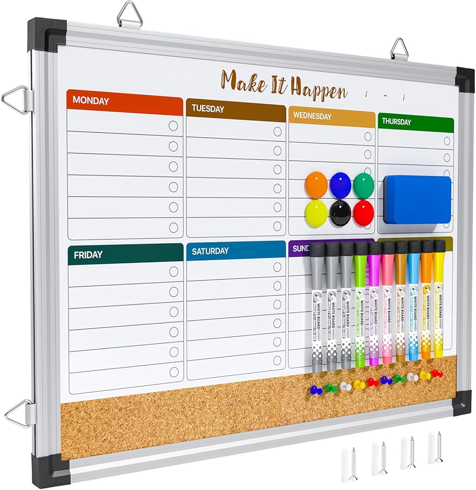 Weekly Planner & Whiteboard: This 17"x13" whiteboard offers double-sided functionality, featuring a whiteboard and dry erase calendar board. One side includes an undated weekly grid for scheduling, while the reverse side is a blank magnetic whiteboard with an integrated cork strip. The dated calendar grid helps organize appointments, and the magnetic reverse side supports dynamic projects