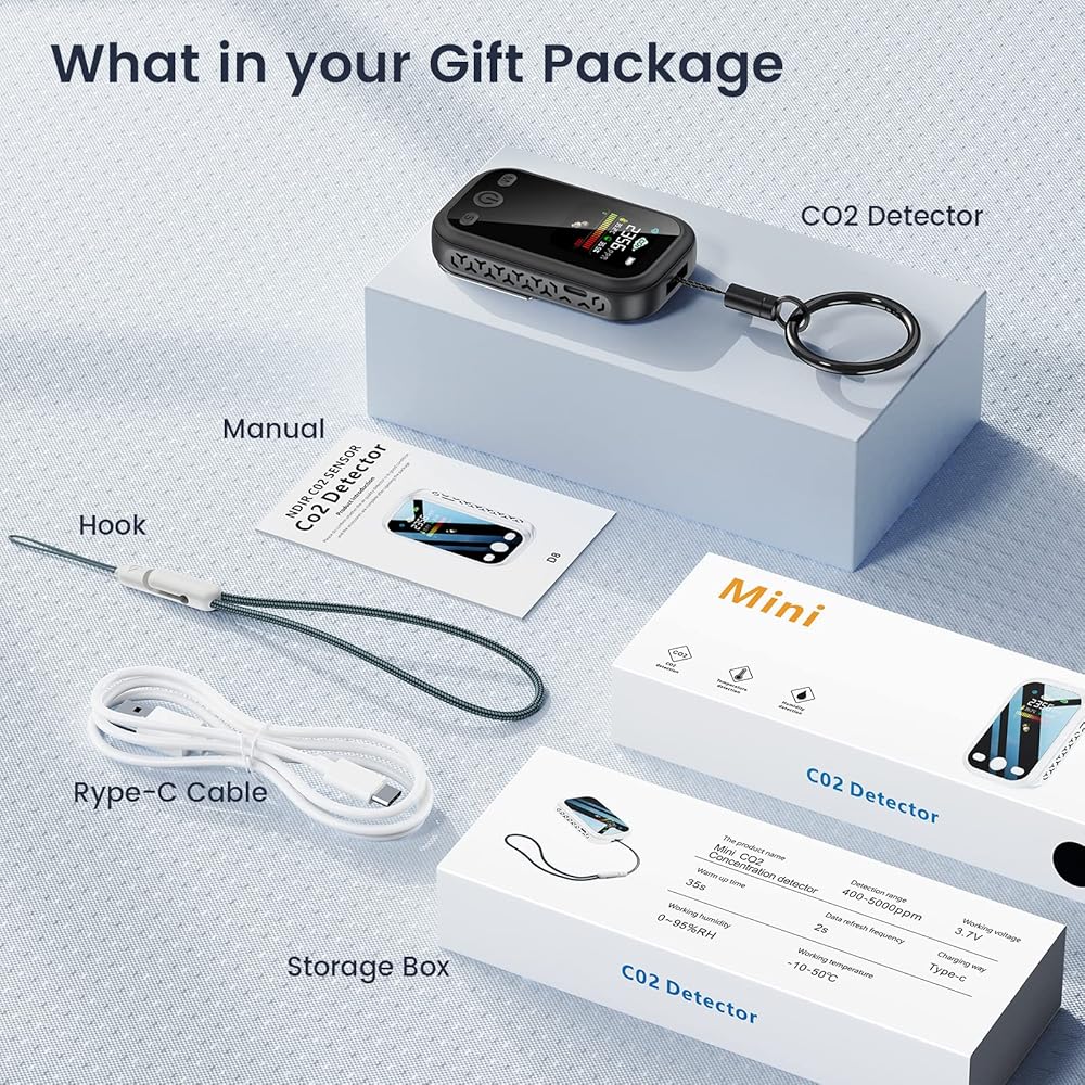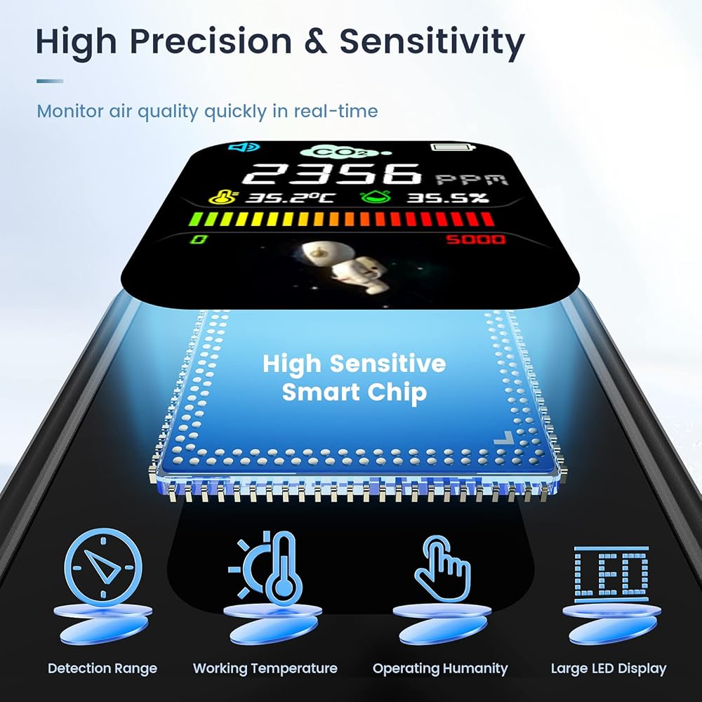 ⏰【High Precision & Sensitivity】Our CO2 monitor is designed with a highly accurate sensor that will measure the carbon dioxide levels and other airborne particles which may be harmful to you and your family. With a clear and easy-to-read display screen that shows the CO2 levels in 0-5000 ppm, this monitor ensures you're breathing in healthy air.
