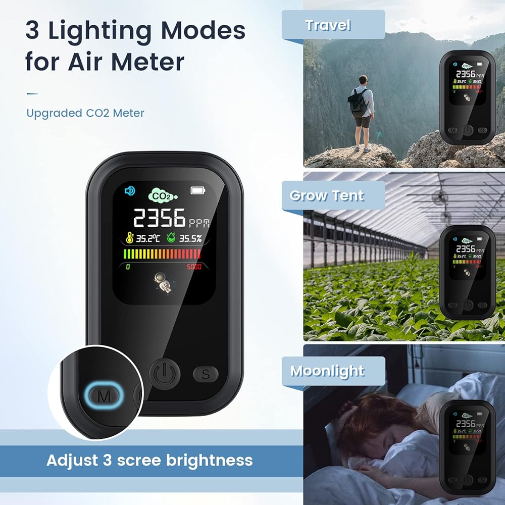 🔋【 Upgraded Button Function】The CO2 detector built-in a high-capacity rechargeable battery , which takes only 2 hours to full charge and up to 20 hours of standby mode. You can also adjust the monitor's brightness to 3 different levels to protect your eyes when you are in different light.