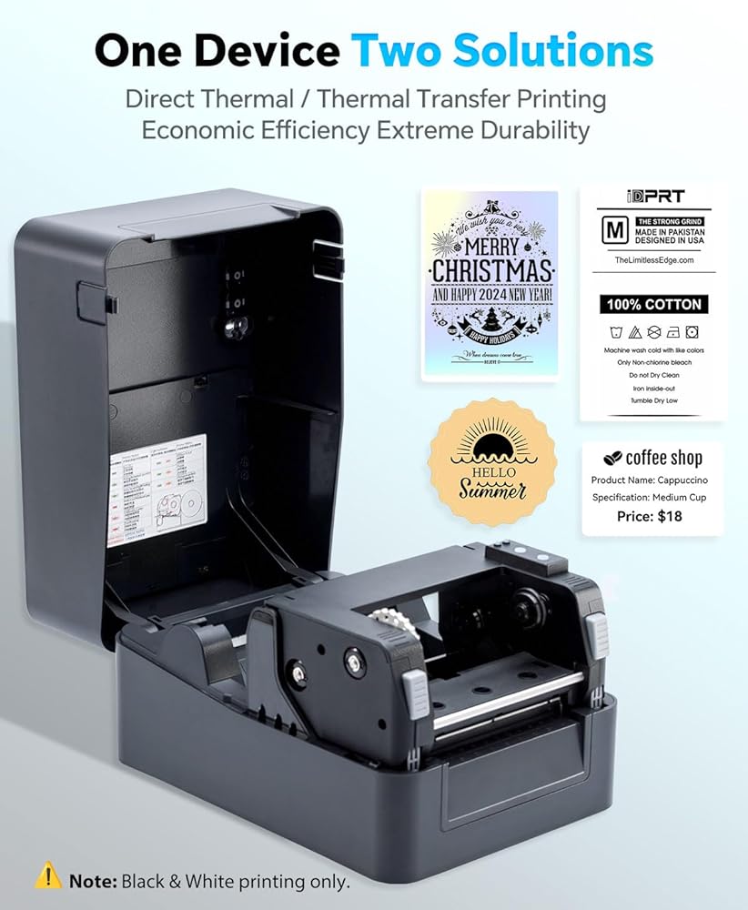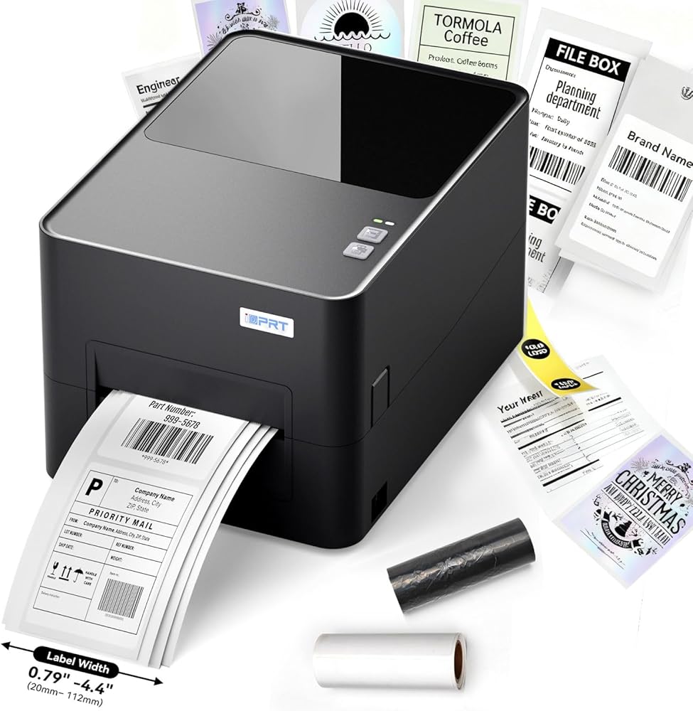iDPRT Thermal Transfer Printer - iF4 desktop label printer supports both Thermal Transfer and Direct Thermal modes, delivering 203 DPI high-resolution prints across a 0.8–4.4 inch width range. Whether you need durable barcode labels, 4x6 shipping labels, or cost-effective stickers, this desktop label printer is designed to handle high-volume commercial printing with precision and reliability—perfect for small business essentials