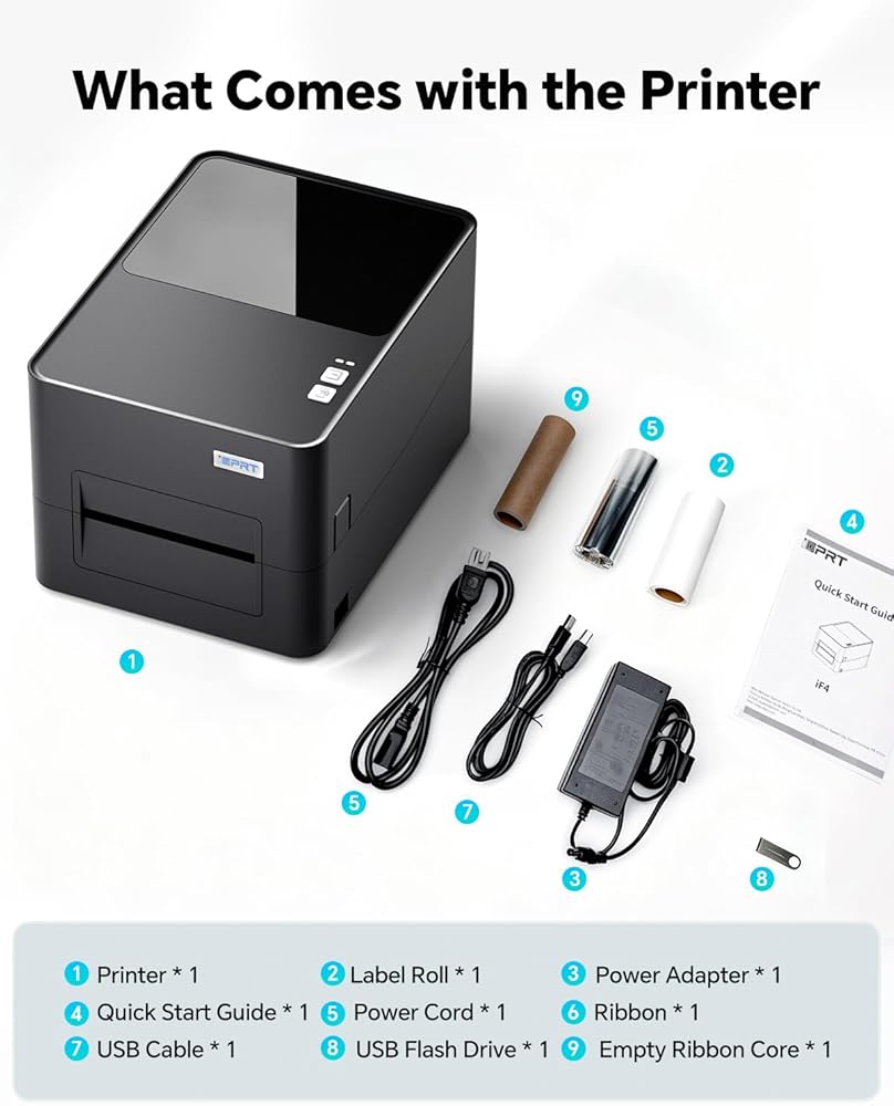 Complete Package & Reliable Support – Comes with everything you need to start printing right out of the box. The package includes 1 x iF4 Label Printer, 1 roll x 100×80mm Thermal Transfer Labels, 1 x Ribbon, 1 x USB Flash Drive for Driver Installation, 1 x Power Adapter, and 1 x USB Cable. iDPRT provides free lifetime technical support, ensuring your thermal shipping printer stays reliable for all your label printing needs.
