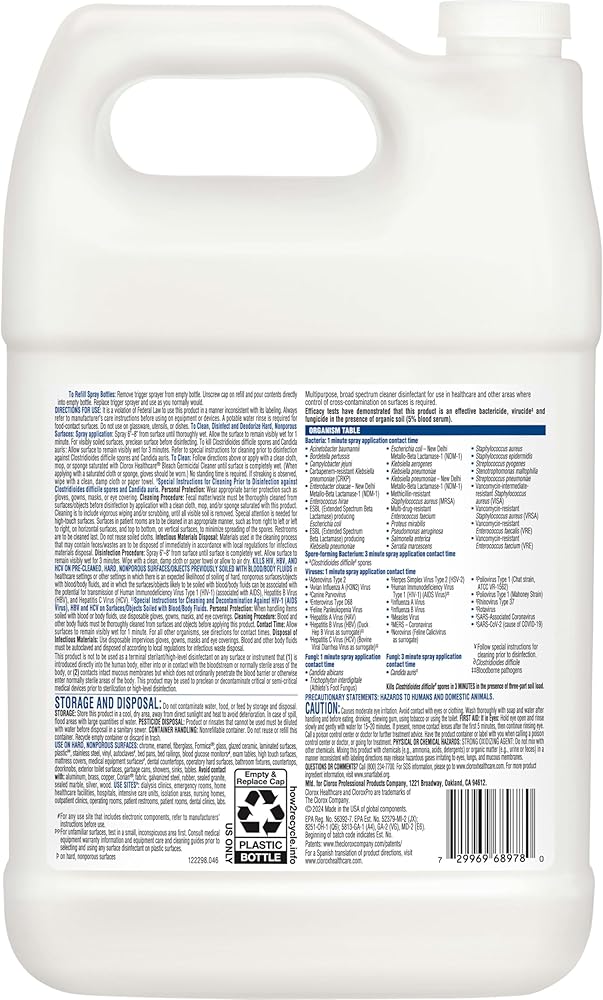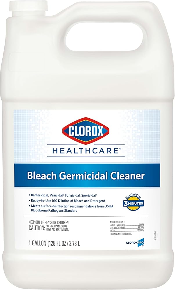 GERMICIDAL BLEACH: Clorox Healthcare Bleach Germicidal Cleaner is a ready to use one-step cleaner disinfectant; EPA registered to kill C.Difficile spores in 3 minutes and 49 other microorganisms in 1 minute