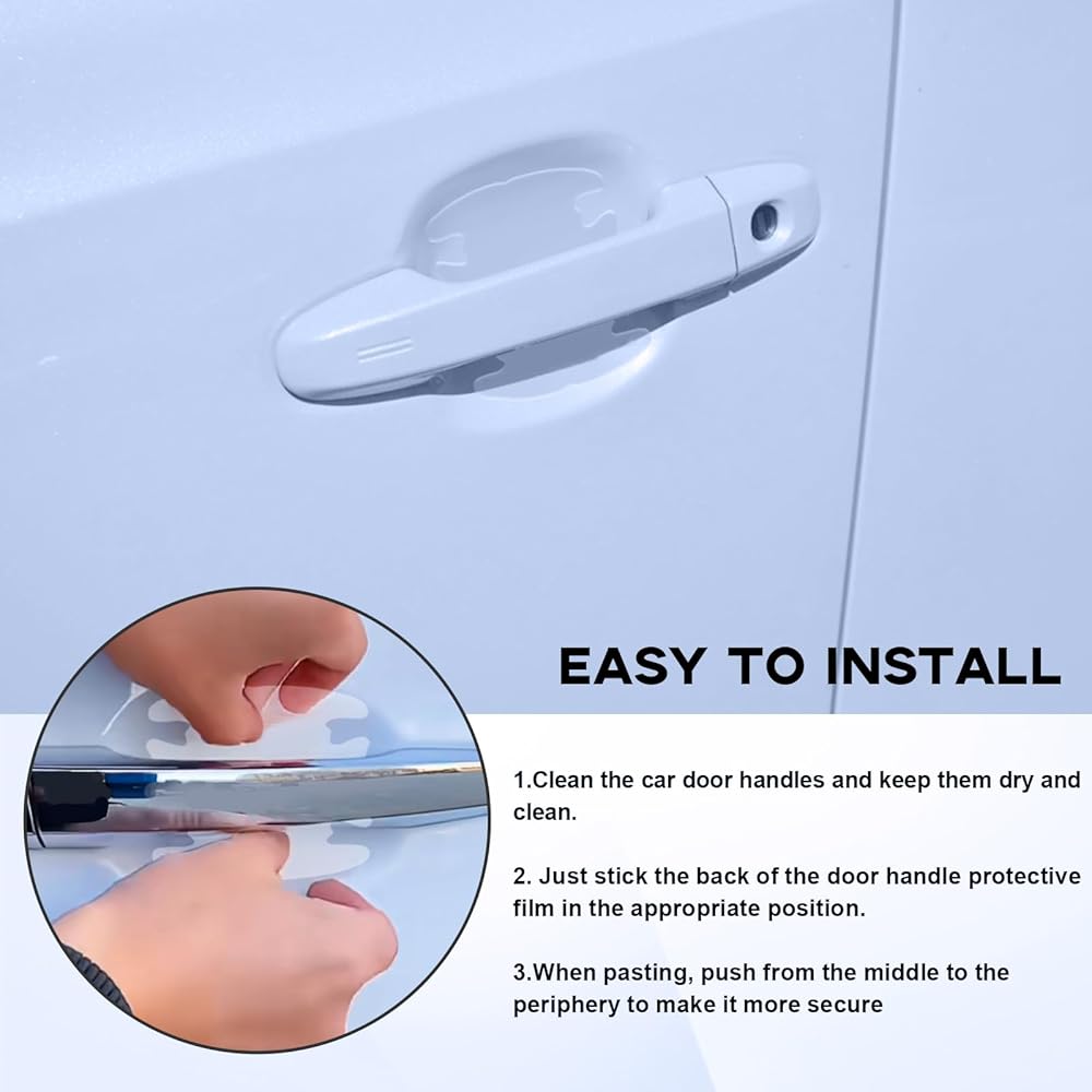 [Easy to Use]: 1.Clean the door handle cup and let it dry. 2.Remove the protective film from the back of the car door protector. 3.Attach the film to the car handle cup and adjust a proper placement to stick it. Easy to install, are perfect car paint protection film