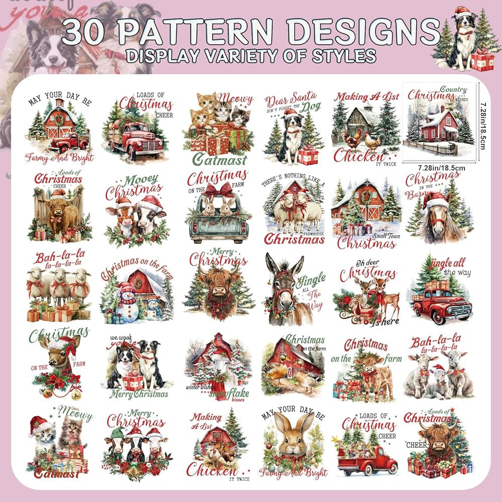 30Pcs Pink Christmas Designs:Our product features 30 exclusive pink-themed Christmas transfers combining classic holiday symbols with modern pink aesthetics. From delicate snowflakes and Santa to "Merry in Pink" typography, these designs offer sophisticated versatility for creating coordinated festive apparel.