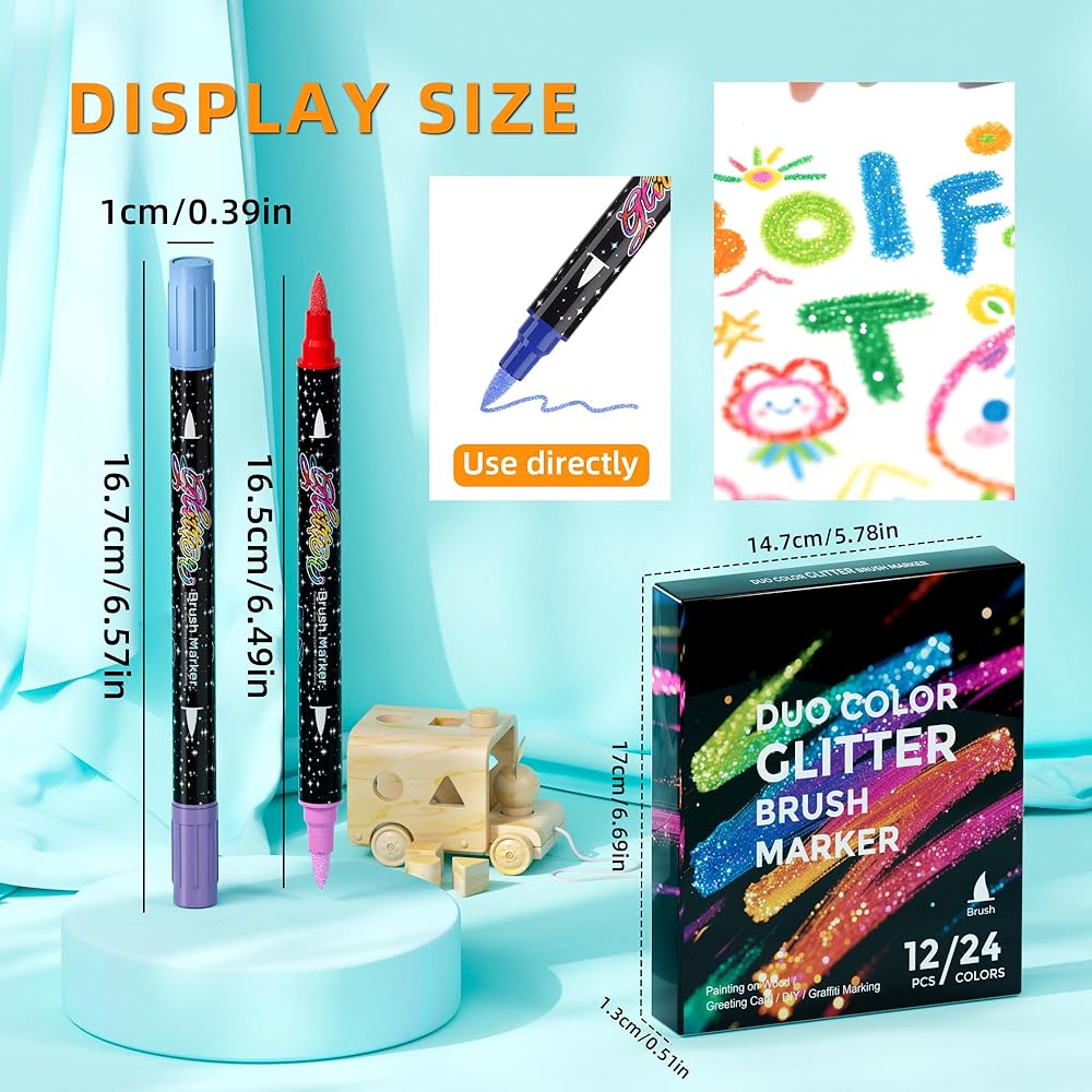 【Widely Used and Covered】:These dual glitter paint markers has a sparkle and attractive writing effect, suitable for casual creation and play. Moreover, these metallic glitter pens works well on photos, greeting card, wood, fabric, paper, and is especially effective on black or dark surfaces.These sparkle brush markers are so fun to apply to a variety of painting interfaces.