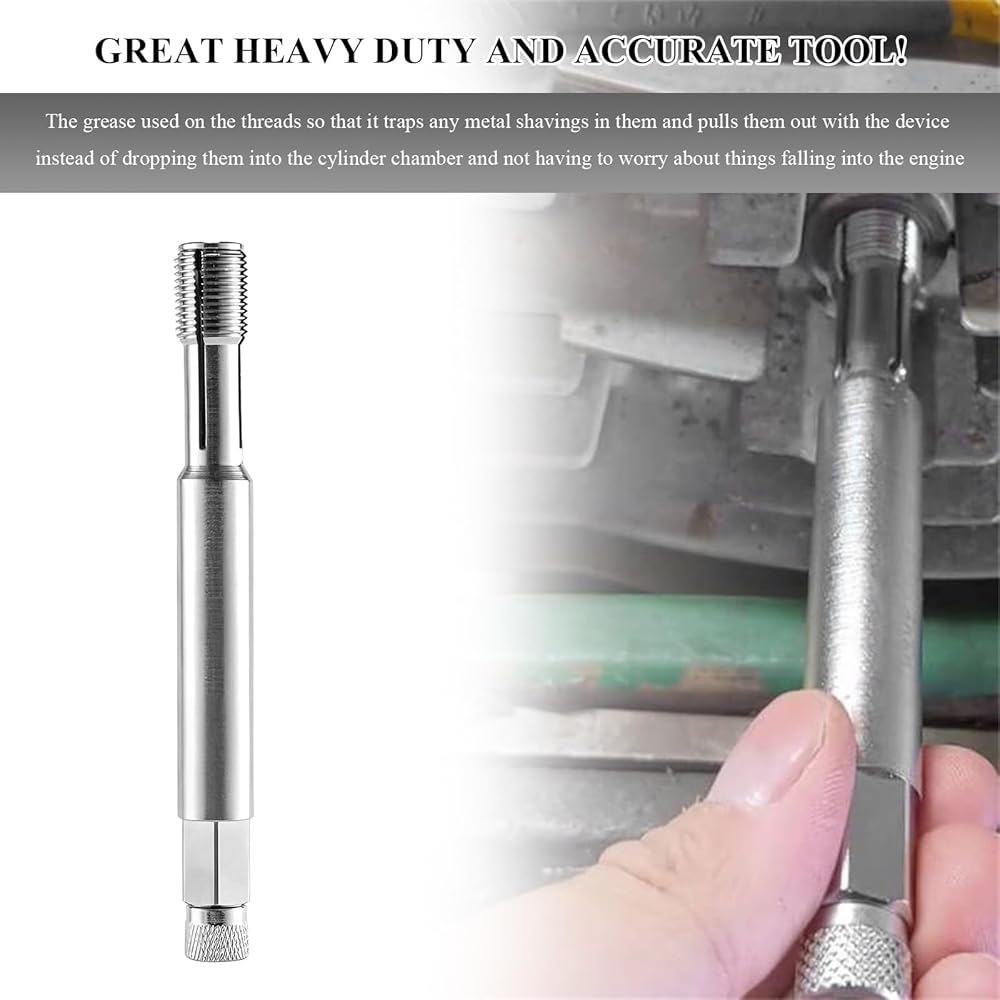 Back Tap Design: This tool features a back-tap design that effectively prevents metal shavings from falling into the cylinder chamber, helping to keep the engine clean. Simply apply lubricant to the thread, and the tool will catch any metal shavings, removing them along with the tool for easy clean-up