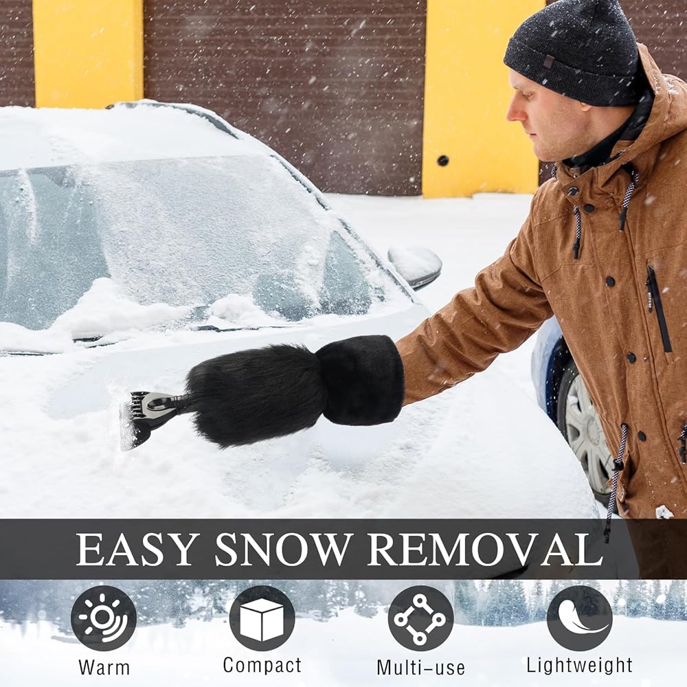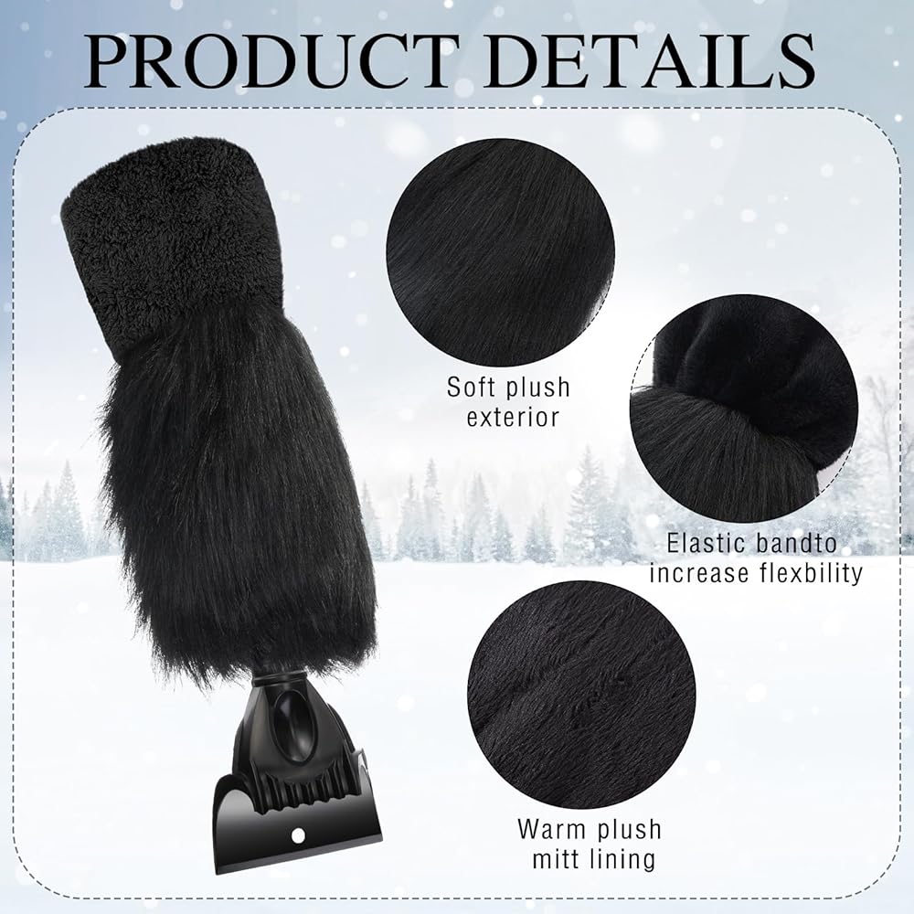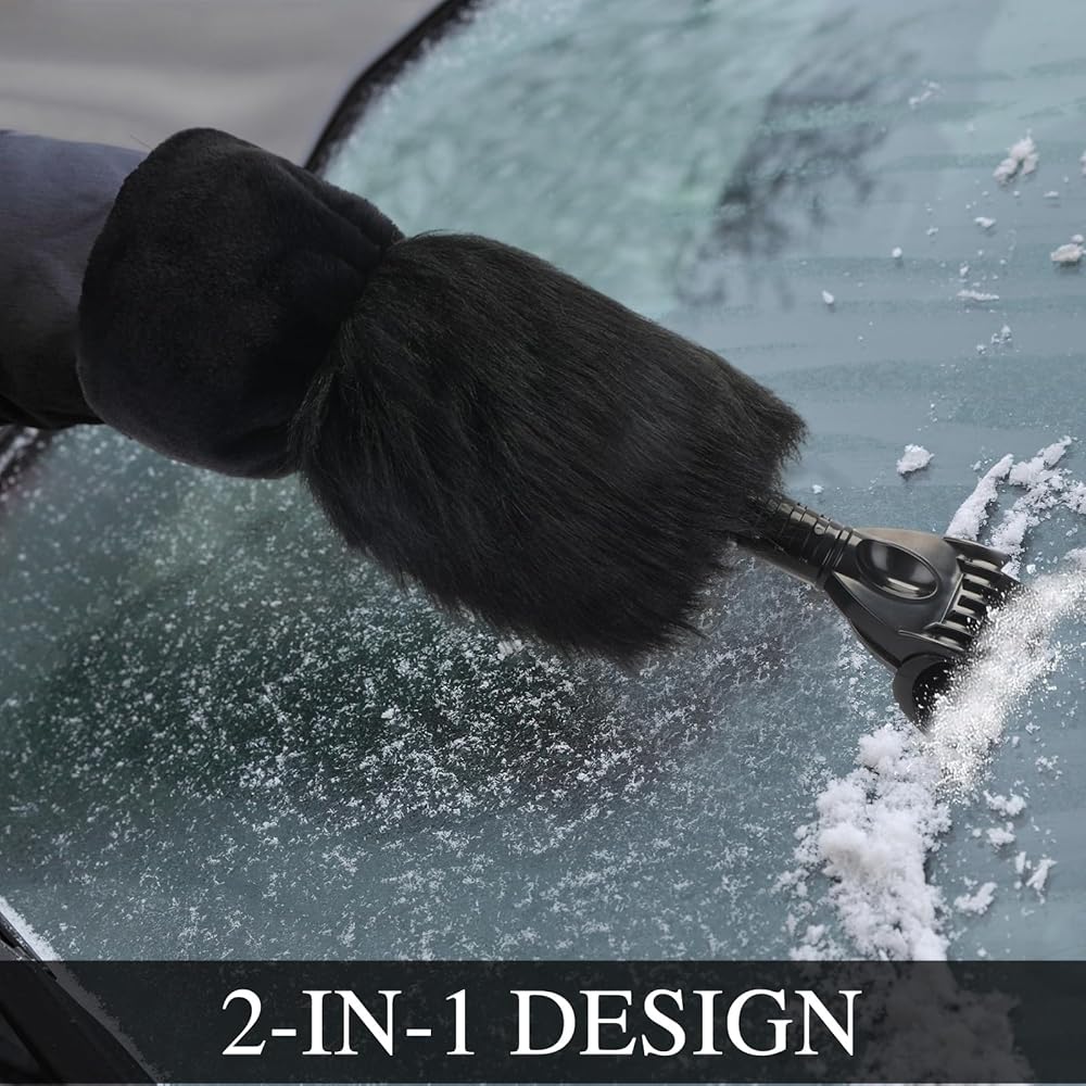 This grey, faux fur car windshield scraper is retractable (16-22 inches) and quickly removes ice. Package includes 2 ice scraper mitts