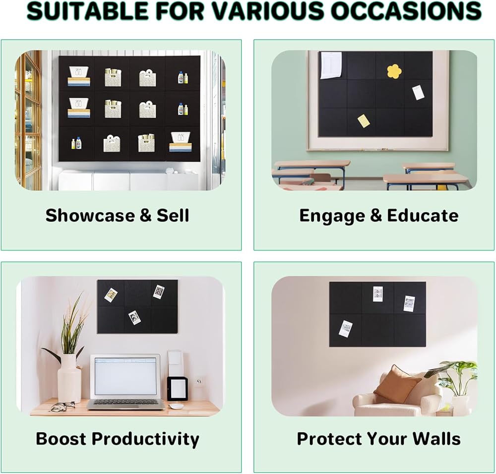 【Ideal for Home & Office Spaces】High-quality and novel felt wall tiles replace traditional cork boards. They are moisture-proof and not easy to change color or mold, their resilient design also safeguards walls from damage and wear over time.Bulletin board are suitable for office decoration, school, and home decoration. can be used to fix documents, notes, and stickers with thumbtacks. cork board can be used as poster boards, bulletin boards, and photo walls.