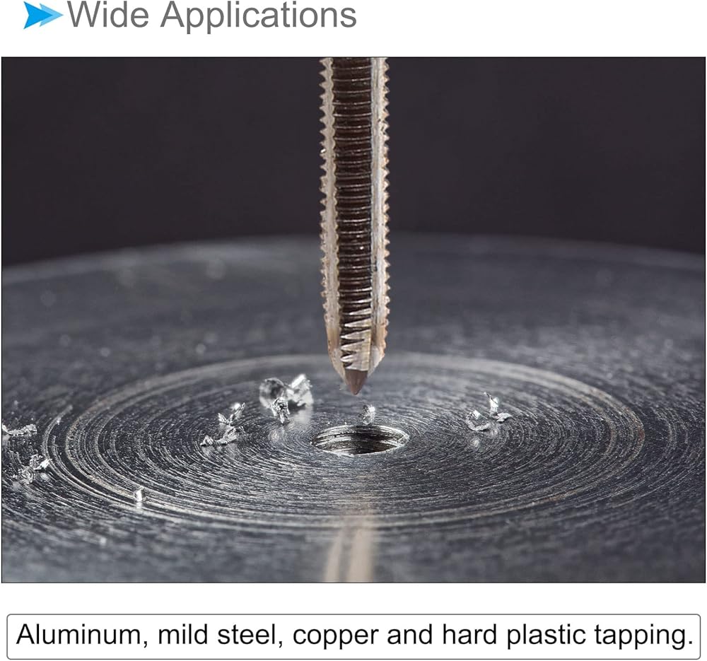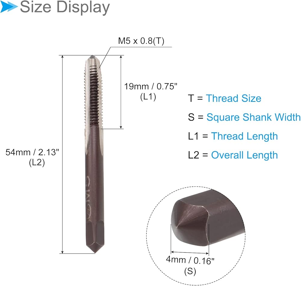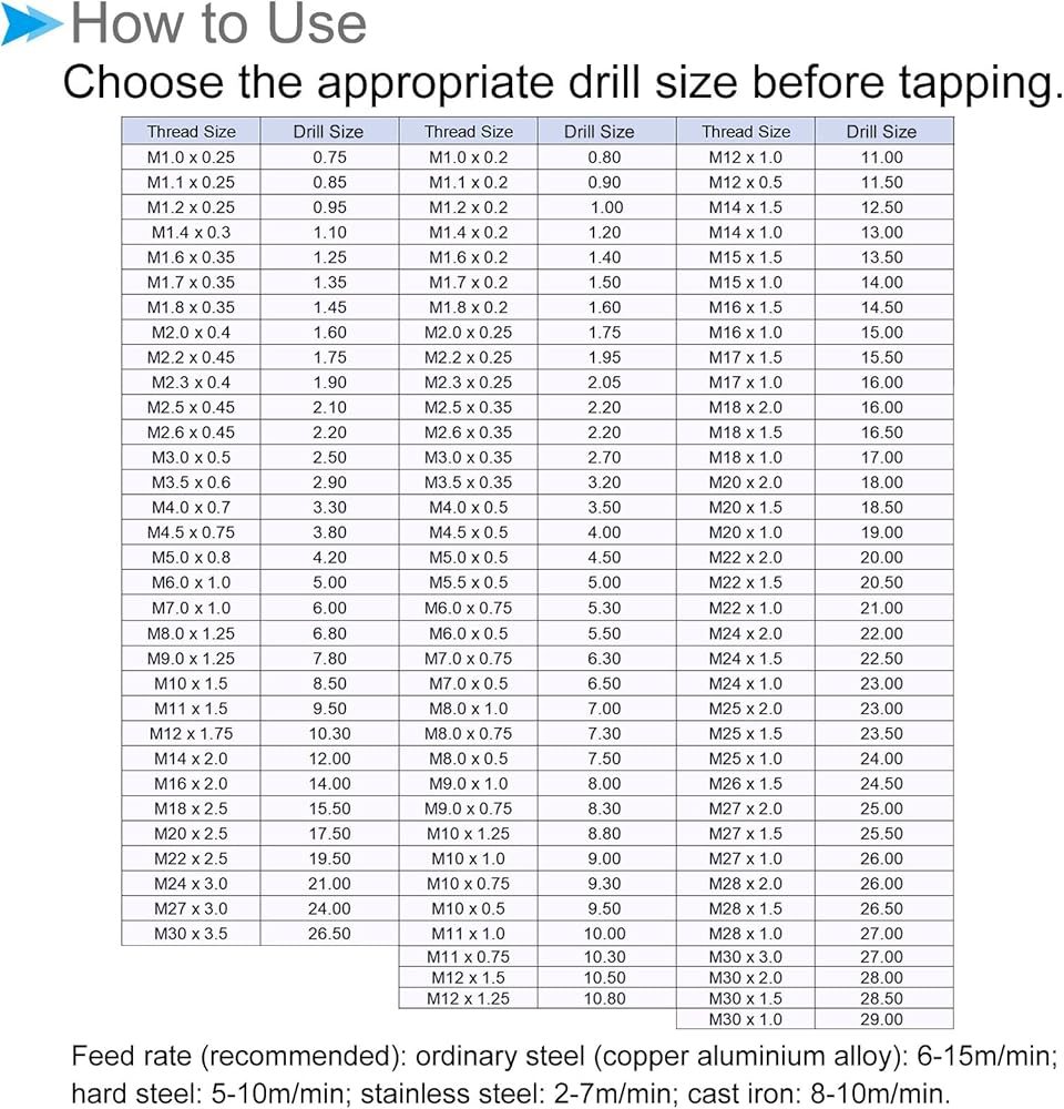 --- Alloy tool steel (9SiCr) screw taps have high hardness, high torque, good toughness and wear-resistance, good for general purpose applications. The surface of the tap has a reddish-brown coating, which belongs to the normal processing technology. ( it is not rusty.) Tapping oil is lubrication, cooling and anti-sticking. Add appropriate tapping oil for higher quality internal threads and more durable taps. The tapping depth should not exceed 1.5 times the diameter (eg: diameter=6mm (M6), maximum tapping depth=9mm). Drill holes with a twist drill before tapping, and the tapping angle should be 90 degrees vertical and stable.