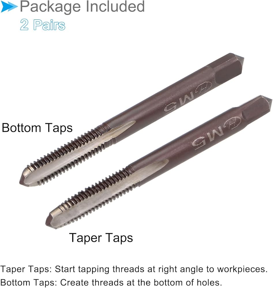 --- Suitable for tapping through or shallow and blind holes. Straight flutes design, downward chip removal, clear threads without burrs, fast thread processing. Hand taps can create new female threads or re-thread damaged or jammed female threads. Used for threading aluminum, mild steel, copper, hard plastic, etc. Hand taps are used by tap wrenches. Taper taps start tapping threads at right angle to workpieces, plug taps is generally used for drilling through holes, and bottom taps create threads at the bottom of holes.