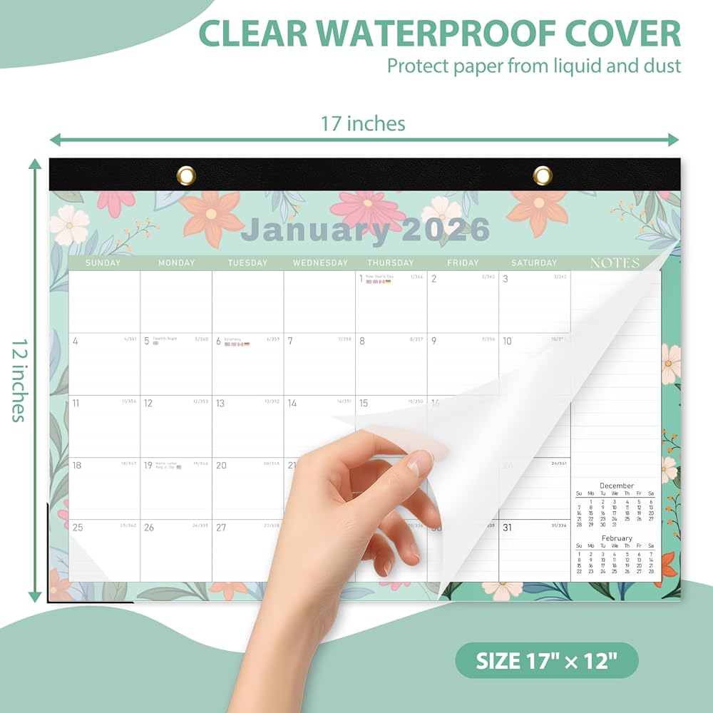 [HANDY FEATURES] - Equipped with a waterproof cover and corner protectors to keep pages safe from spills and wear, our desk pad calendar also features two hanging holes and a strong rope, which lets you hang it on the wall for easy reach or set it on the table for handy access.