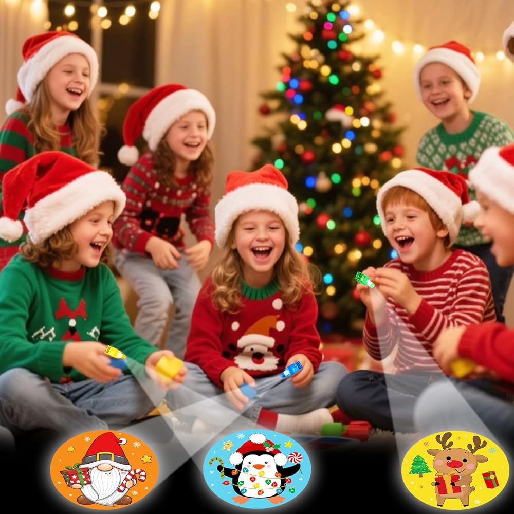 🎨【Easy and Fun to Use】Remove the insulating sheet, press the button to project joyful Christmas patterns—Santa, Christmas tree, snowman motifs that fill space with festive fun. Elastic straps make them easy to wear, perfect as kids' Christmas favors. Pair with gift bags to boost holiday and party joy!