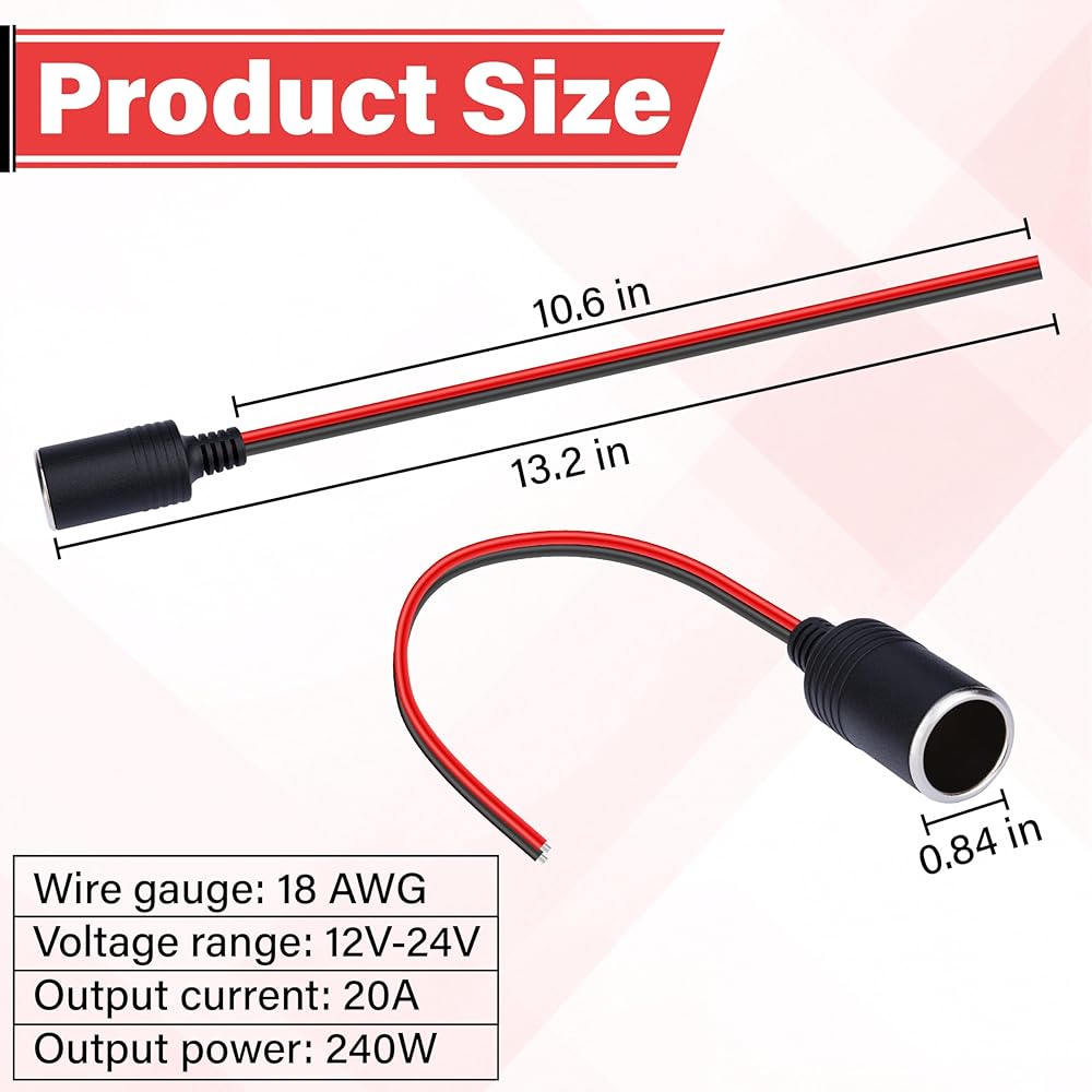 Parameter Details: With a wire gauge of 18 AWG, voltage range of 12V-24V, output current of 20A, and output power of 240W, the female cigarette lighter socket features a total length of 33.5cm/13.2 inches and a wire length of 27cm/10.6 inches, making it compact and easy to store
