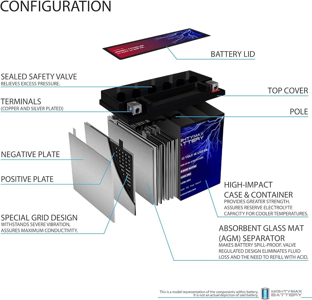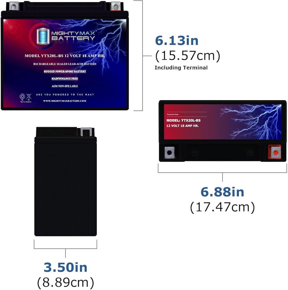 الأبعاد: 6.88 بوصة × 3.50 بوصة × 6.13 بوصة. القطبية: سلبي على اليسار، إيجابي على اليمين. القائمة مخصصة للبطارية والمسامير فقط. لا يتضمن أي سرج سلكي أو ملحقات تثبيت.