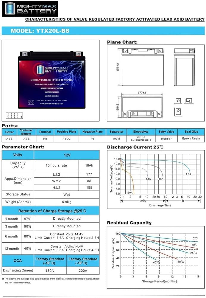 YTX20L-BS عبارة عن بطارية حمض الرصاص المختومة (SLA) بقدرة 12 فولت 18AH 270 أمبير (CCA)