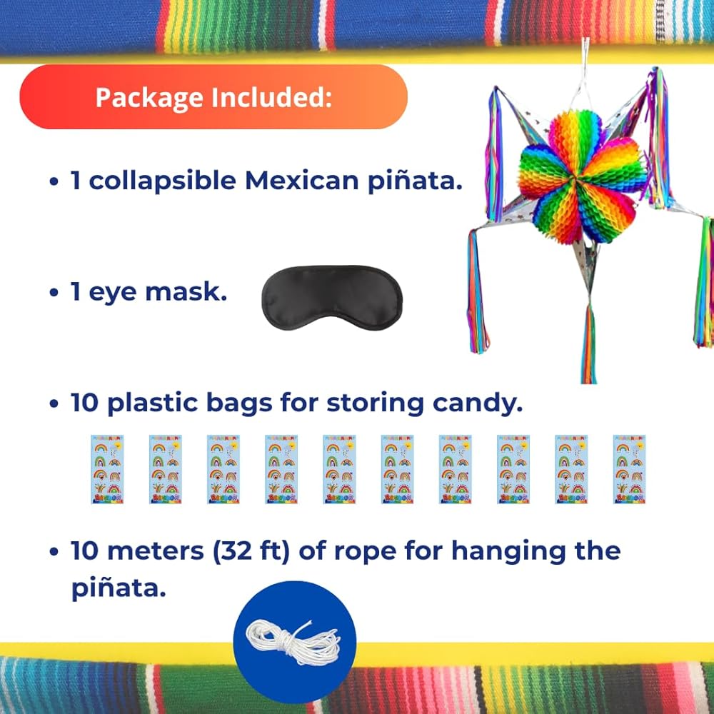 🎁 Complete Party Kit Included – Comes with 32.8 ft of rope for hanging, a colorful blindfold, and 10 candy bags—everything you need to enjoy a traditional cinco de mayo pitcher game at your next event.