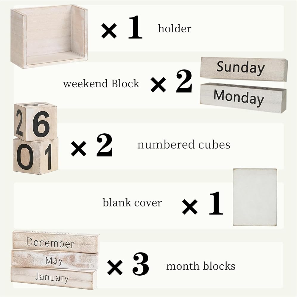 ✦ Complete Wooden Block Calendar Set - This perpetual block calendar set includes 2 numbered cubes, 3 month blocks, 1 blank cover, and 1 holder. Available in Pink, Vintage Natural, and Black & White, it offers versatile desk decor options for any space—whether cubicle decor or home entryway decor.