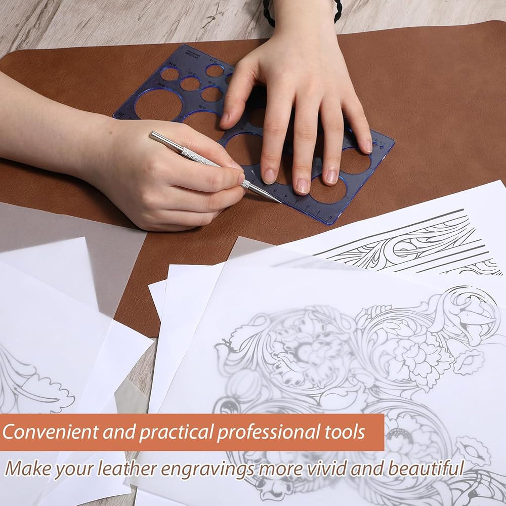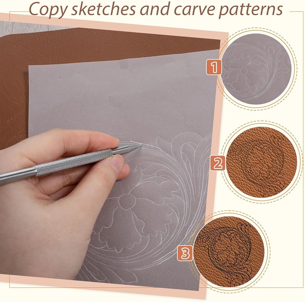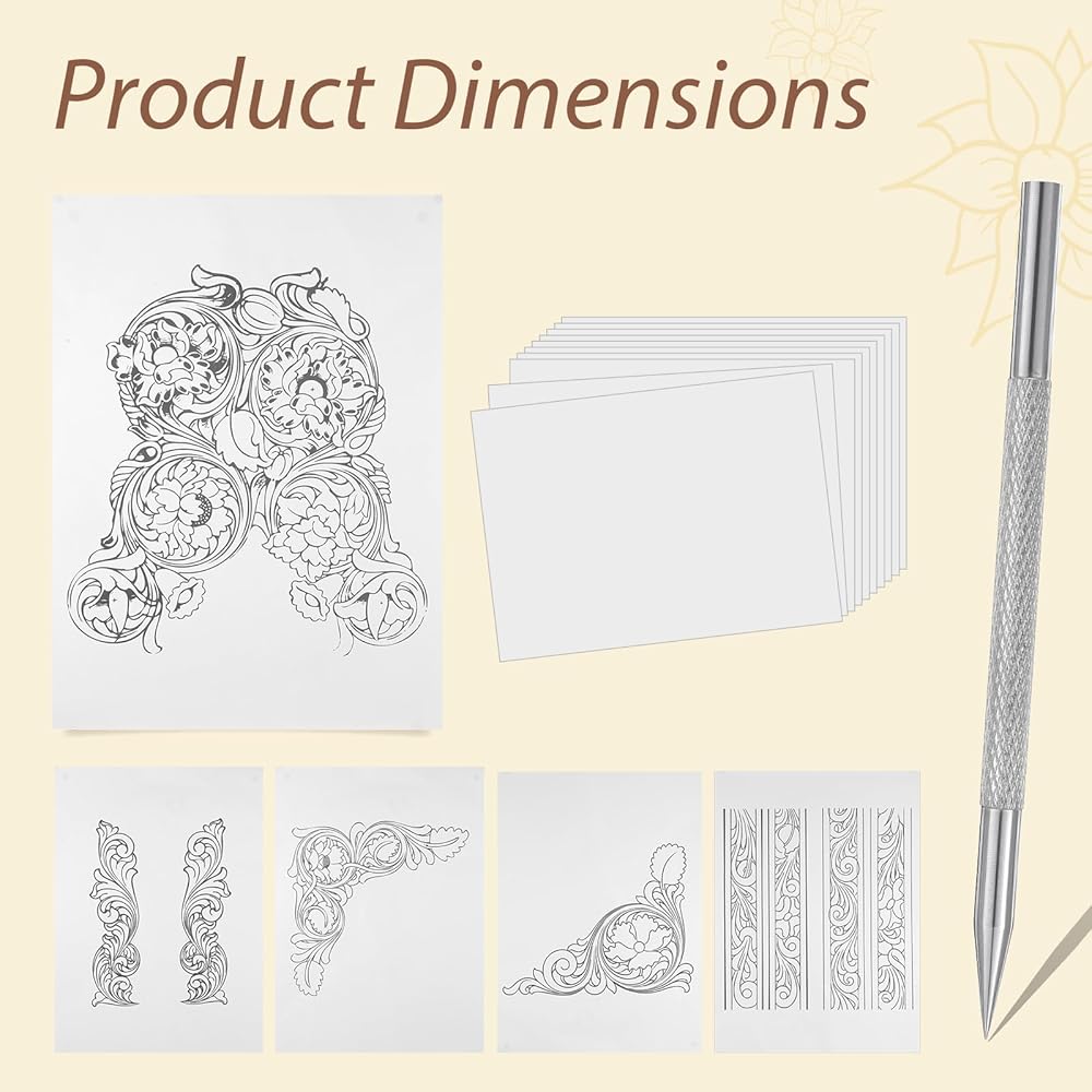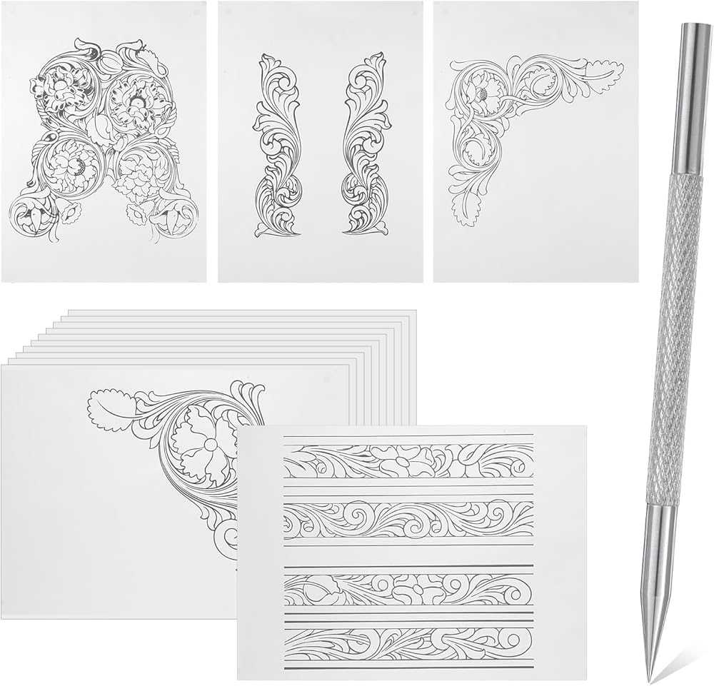 Leather Embossing Kit: The set includes 1 metal marking pen, 10 transparent papers and 5 non-repeating leather engraving pattern papers to meet your basic pattern transfer and handcraft needs