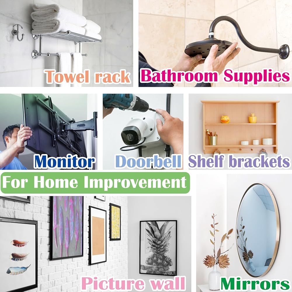 Hangs up to 50 lbs, uesd for hall, bathroom and kitchen hanging accessories, artwork, shelving, light fixtures, mirrors, big picture frames, TV, bike, shelf straps, cabinet & decoration fixing, calligraphy, wall cabinets, curtain rods and small decorative shelves, and more.