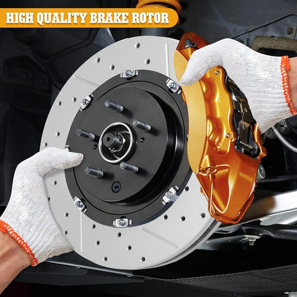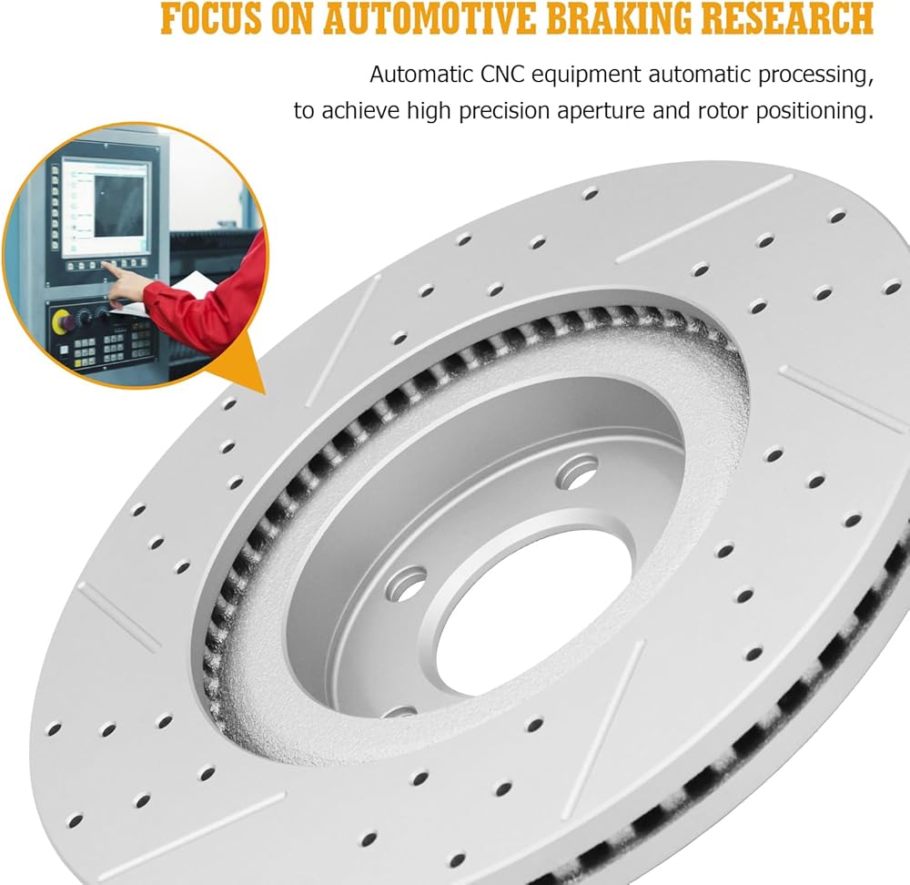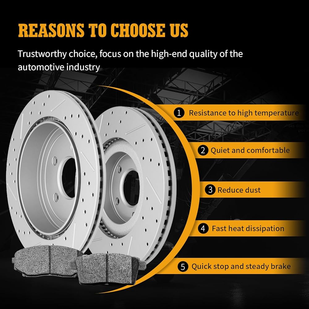 🚙【High-quality craftsmanship】:Vented Drilled and Slotted Disc Brake Rotors are plated with silver coated zinc dichromate for attractive protection against rust and corrosion and long service life. Premium low-dust ceramic formula brake pads keep rims clean and reduce noise.