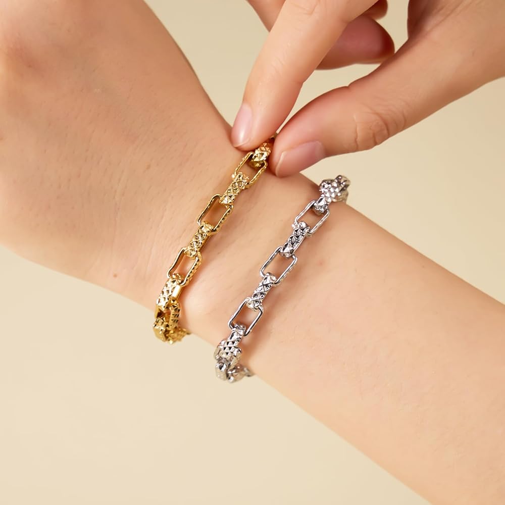 Chain Size: The embossed square box chain link size is about 9.5mm long, 5.7mm wide and 2.8mm thick; the lobster clasp size is about 12mm long; the open jump ring diameter is about 6mm. The craft chain size is small and exquisite, you can choose to stack them or wear them individually.