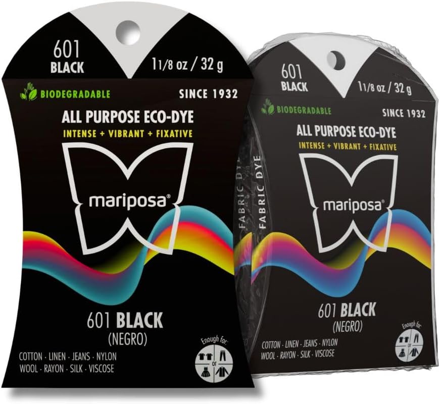 Black (601) Fabric Dye is a long-lasting, high-fixation fabric dye designed to bring rich, vibrant color back to your favorite pieces. Whether you're restoring a faded garment or adding a fresh new shade, this all-purpose eco-dye delivers consistent, permanent results. Crafted using biodegradable, non-toxic ingredients, this powder works beautifully on cotton, linen, jeans, rayon, wool, viscose, silk, and other natural fibers — offering a cleaner, earth-friendly alternative to harsh chemical dyes. Each pouch colors up to 2 lbs of fabric, making it ideal for apparel, accessories, and home textile projects. The fine powder dissolves easily in warm water for smooth, even coverage without streaks, blotching, or uneven patches. Perfect for DIY creators, upcyclers, and anyone wanting deep, saturated color that lasts wash after wash. Ships as a 3 Pack, (3) Pouches in each Shipment. Made using dye expertise that dates back to 1932, this formula combines decades of color knowledge with modern, eco-conscious innovation — giving you a reliable, planet-friendly way to renew and personalize what you already own.