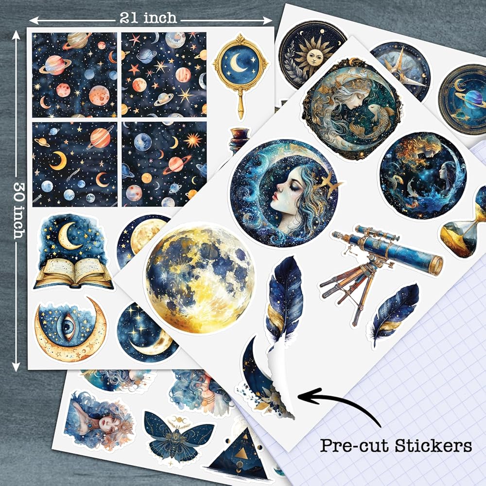Made with high-quality waterproof vinyl, these stickers aesthetic vintage and washi stickers for scrapbooking are durable, easy to peel, and leave no sticky residue. Ideal for solar system stickers for project, grimoire stickers, or sci fi stickers, they fit both kids and adults who adore space and celestial themes.