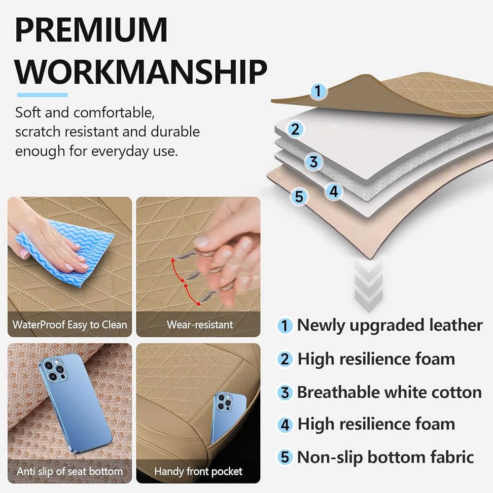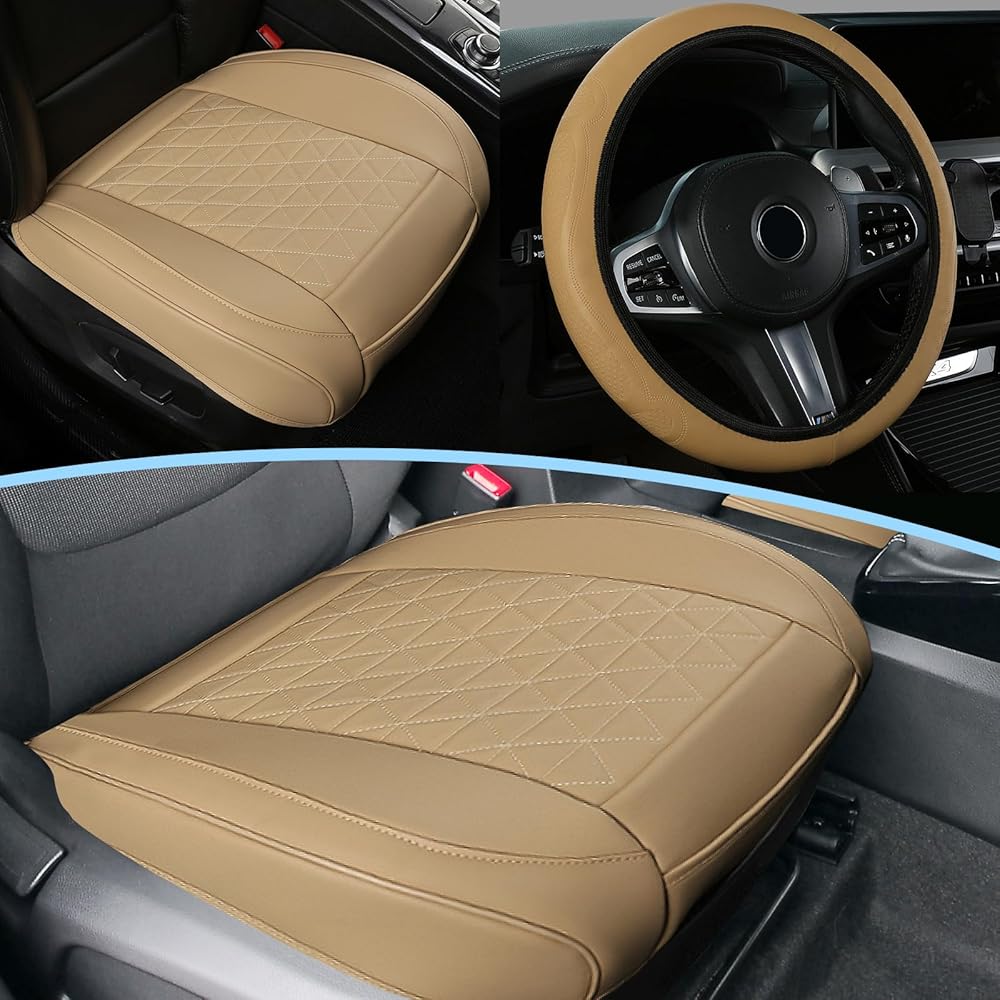 UPGRADED ABRASION-RESISTANT LEATHER: This car seat cover for the lower front offers excellent durability and water resistance. It effectively prevents fading or wearing out the original seat. The built-in high resilience foam provides comfort for long drives. Package includes steering wheel cover. It can meet our needs.