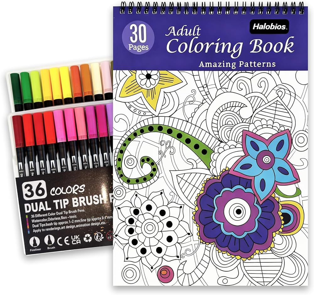 Adult Coloring Book Set with 36 Dual-Tip Markers, 30 Patterns Spiral Bound Coloring Book for Adults Relaxation, Crafts for Adults Women, Anxiety Relief Mindfulness Relaxation Gifts for Adult