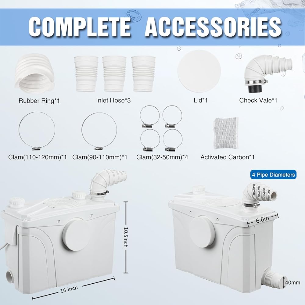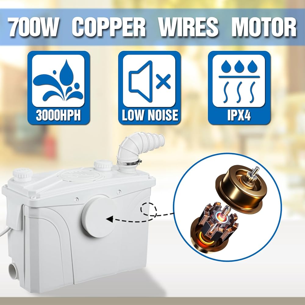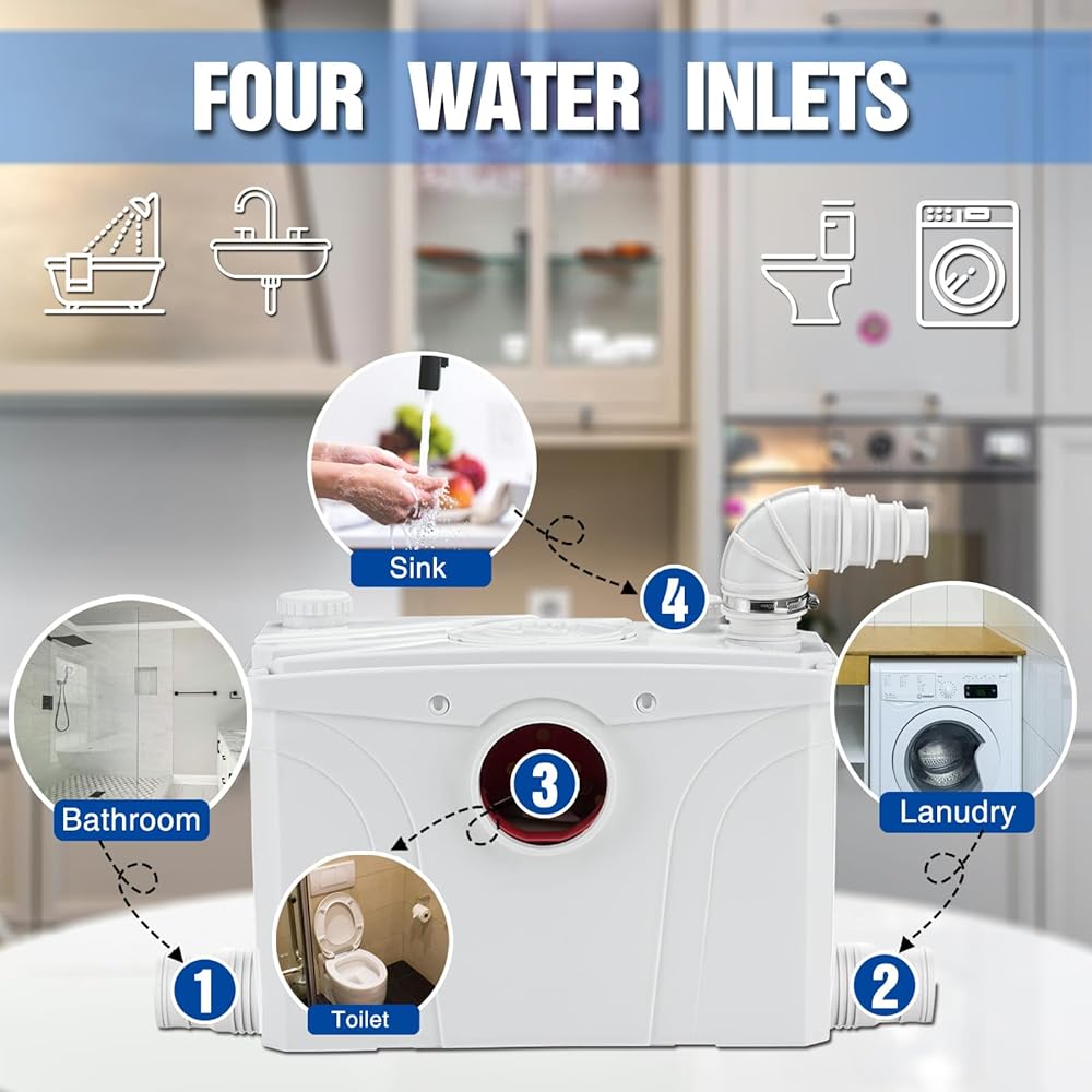 700W Macerator Sewerage Sump Pump with 4 Water Inlets for Upflush Toilet System Waste Water Marine Toilet Disposal Laundry