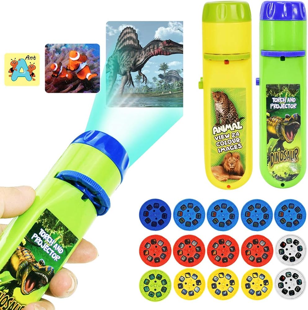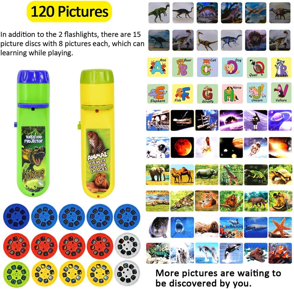 🐻【120 Images & 5 Sets of Themes】2PCS Unlike most of the projector on the market, Our projector have more images and more vivid colors.120 different pictures and 5 sets of themes,open it and let your child enter the Dinosaur, Sea Animals, Space, Animal, 26 letter world!