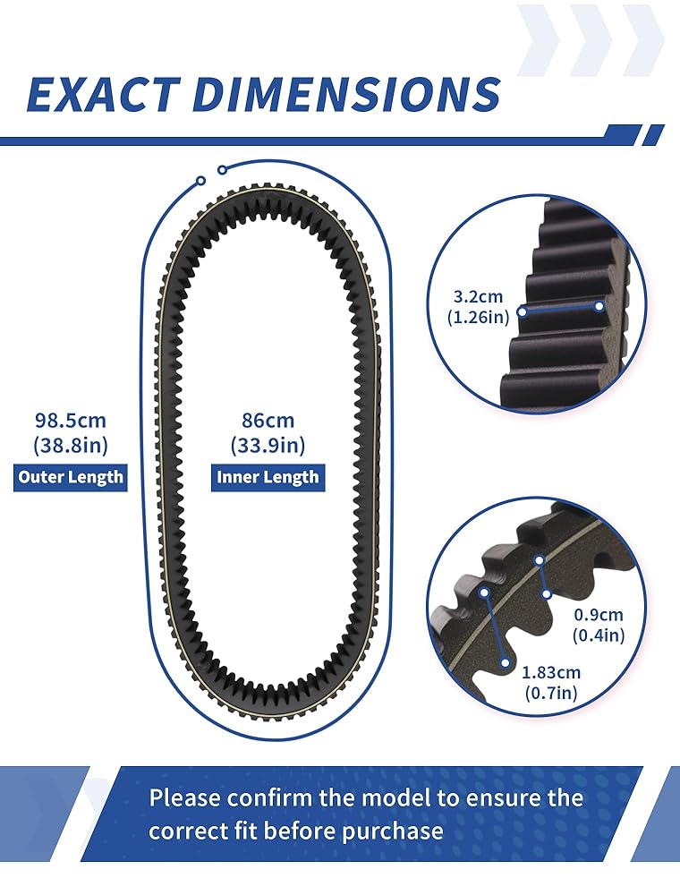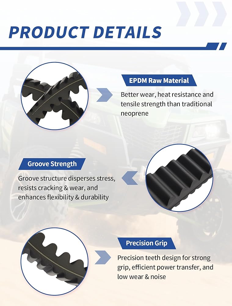 【Anti-Slip Drive Belt】 Upgraded grooves increase friction and clutch grip, preventing slip during acceleration, climbing, towing, or heavy loads. Ensures smooth power, better throttle response, and efficient UTV drive belt performance.