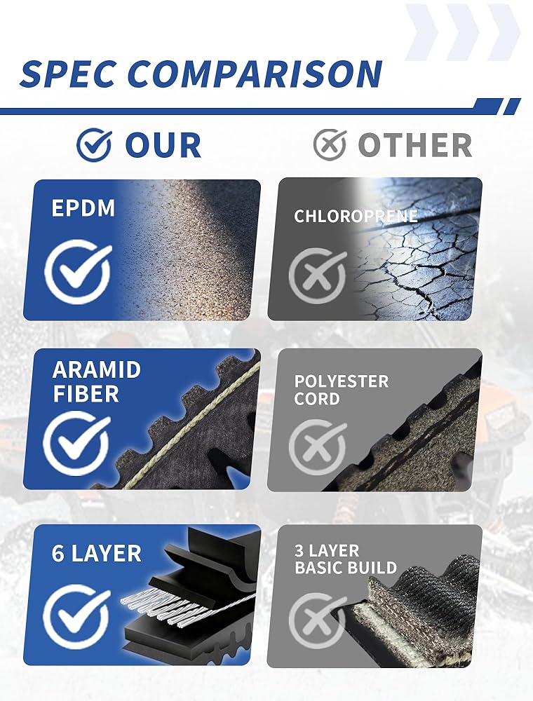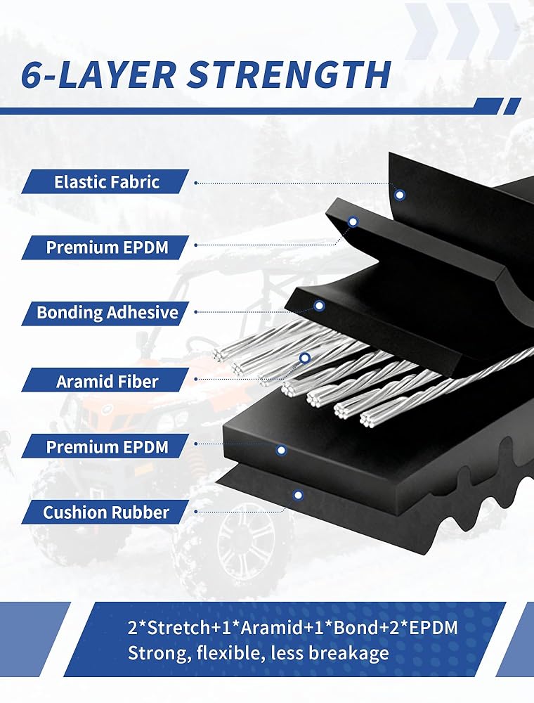 【6-Layer Composite Belt】Our EPDM drive belt features a 6-layer design, outperforming 5-layer alternatives in stability and load capacity. Extra layer enhances tensile strength and impact resistance, preventing deformation under heavy loads. It boosts wear resistance and reduces slip, delivering longer service life and more reliable power transfer for intense off-road adventures.