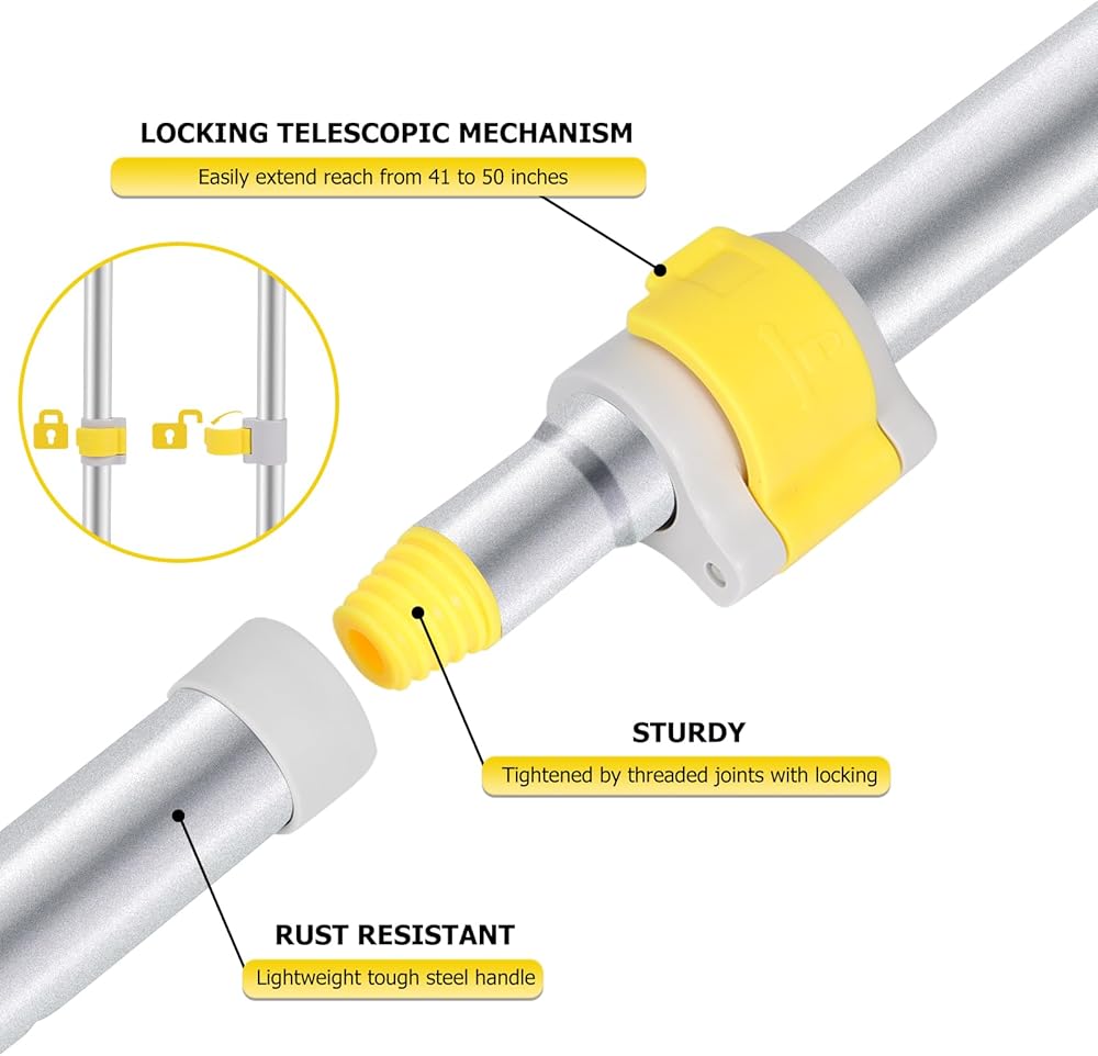 【Lightweight Non-slip Handle】The extendable pole is made of sturdy iron, it is not easy to bend, break and rust in using. The EVA padded handle has a good touch. easy to hold even when wet. It also has a hook wheee you can hook it to a wall. Keeping your clutter to a minimum.