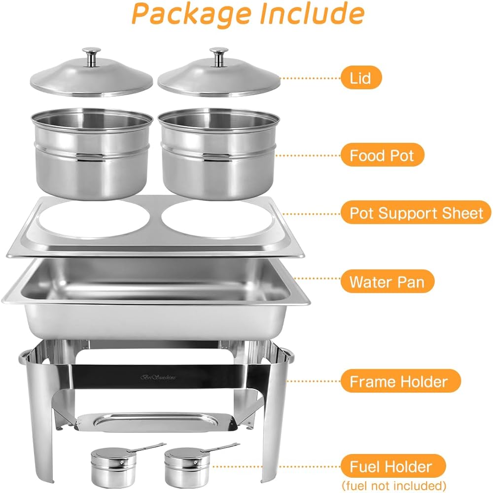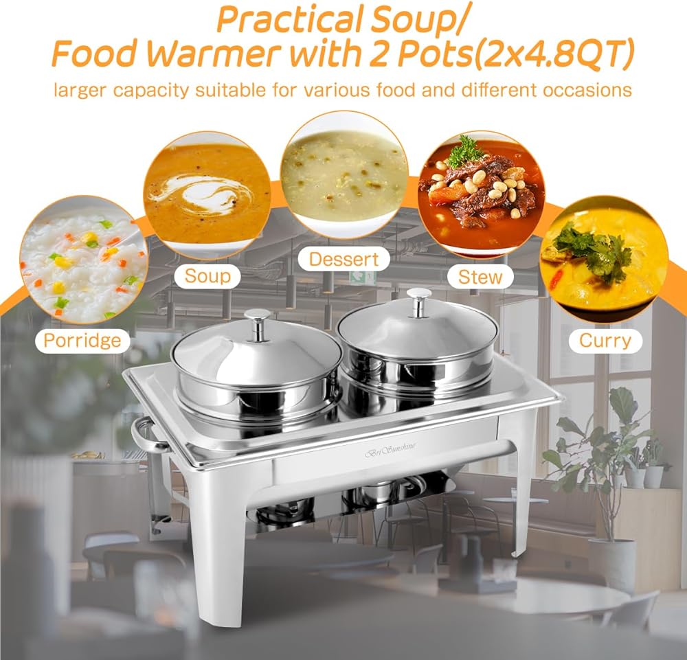 【Premium Stainless Steel Material】--- Our soup chafer station is made of food-grade stainless steel with mirror finish which is more durable and rust-resistant. Thickened frame support ensures higher sturdiness and durability. They are built to withstand daily use in commercial or home kitchens