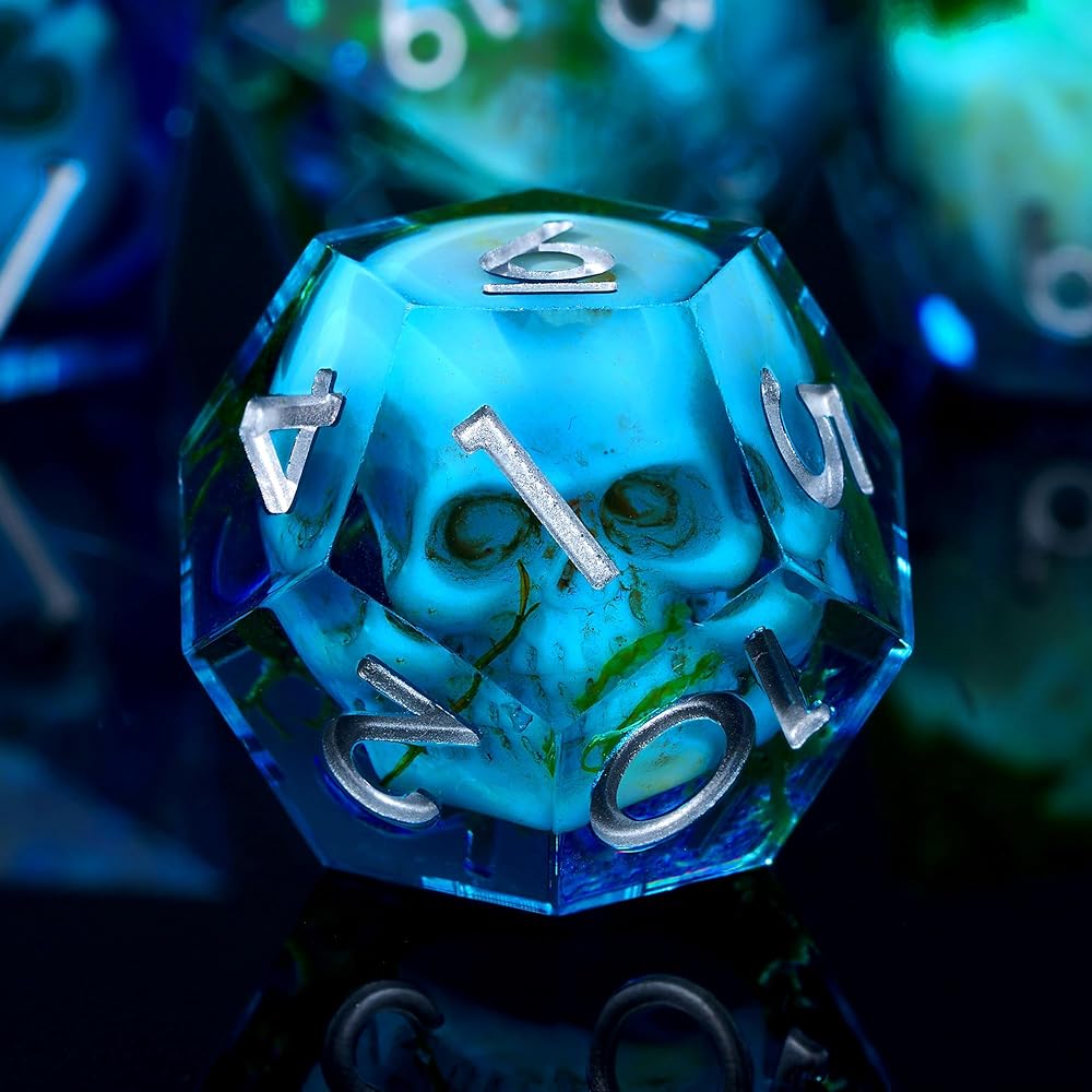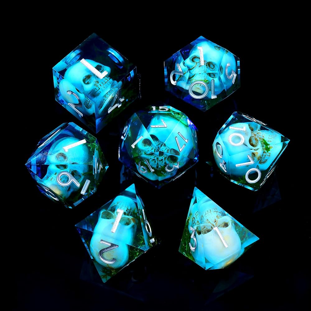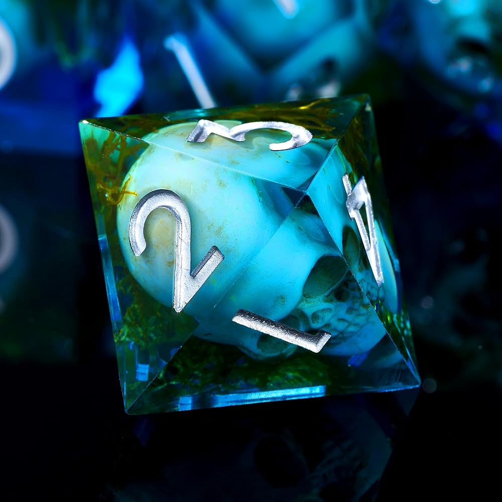 HANDMADE DESIGN: Each die is handmade from clear resin and contains a tiny skull and green water Moss, perfectly suspended as if dredged from a haunted swamp. A unique, eerie look that sets the mood for FOR dungeons and dragons and other RPG adventures.