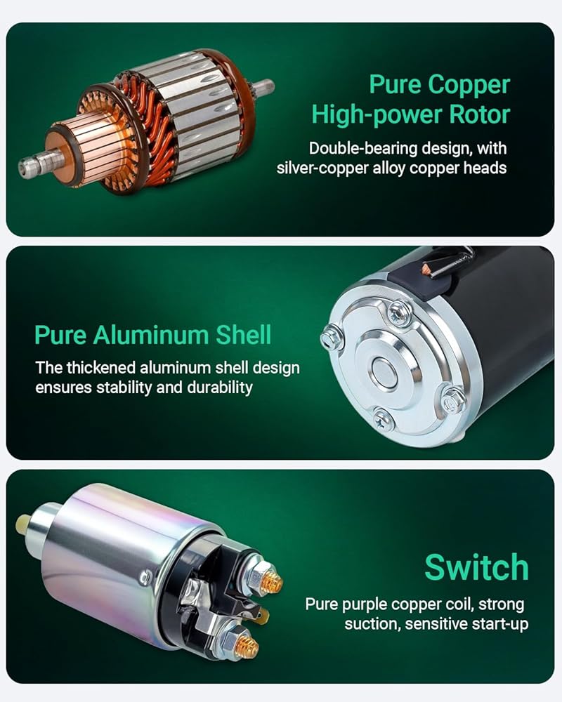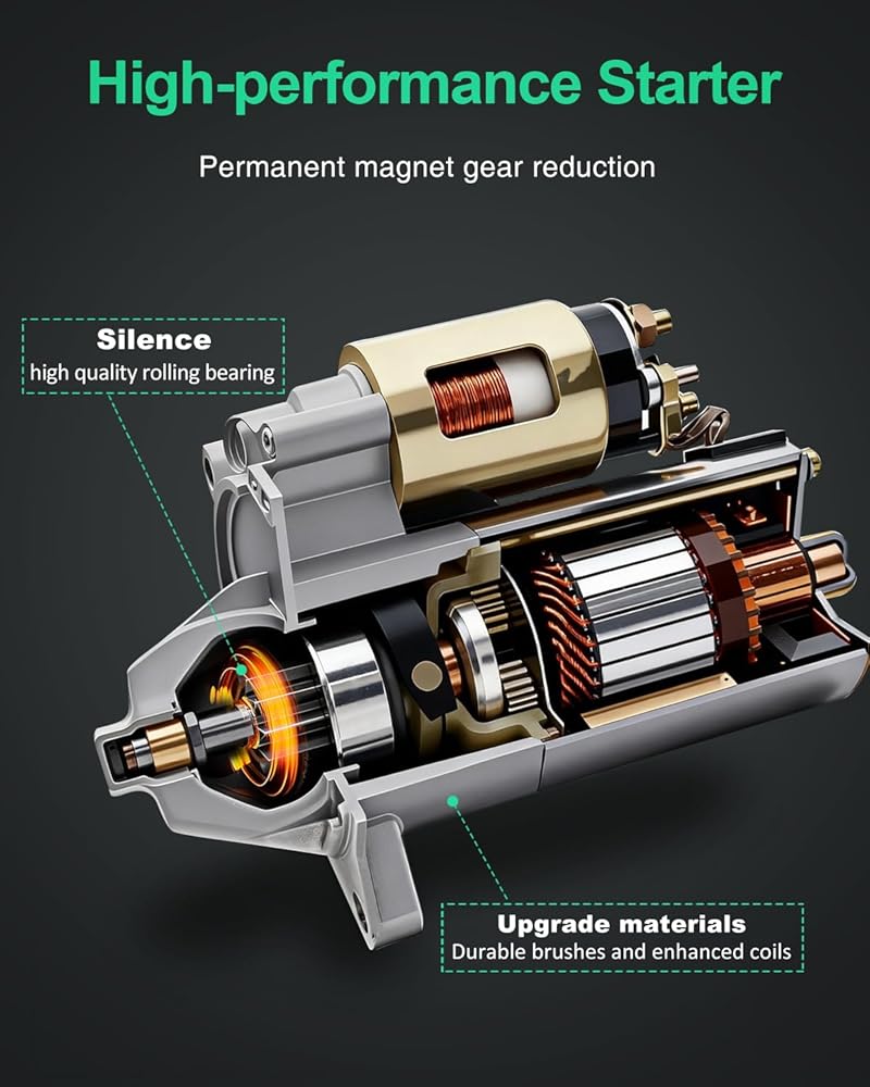 [Silent Operation] - The car starter motor uses low-friction and high-strength materials to make key components, reducing noise generated during operation. Combined with more precise manufacturing processes, it ensures more accurate fit between components and lowers noise levels