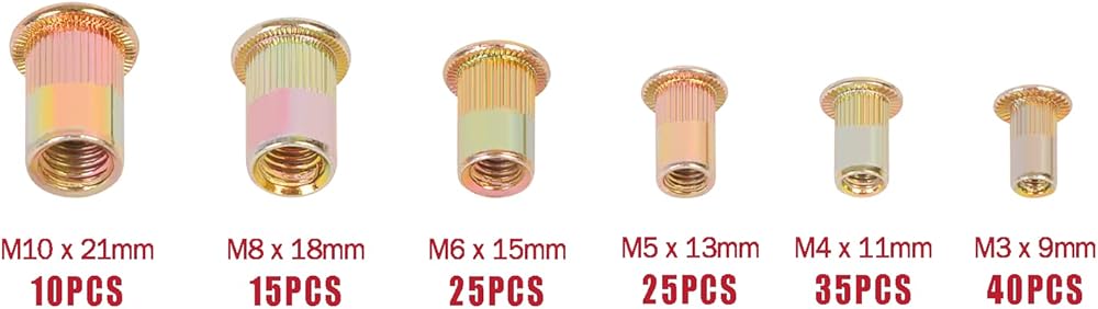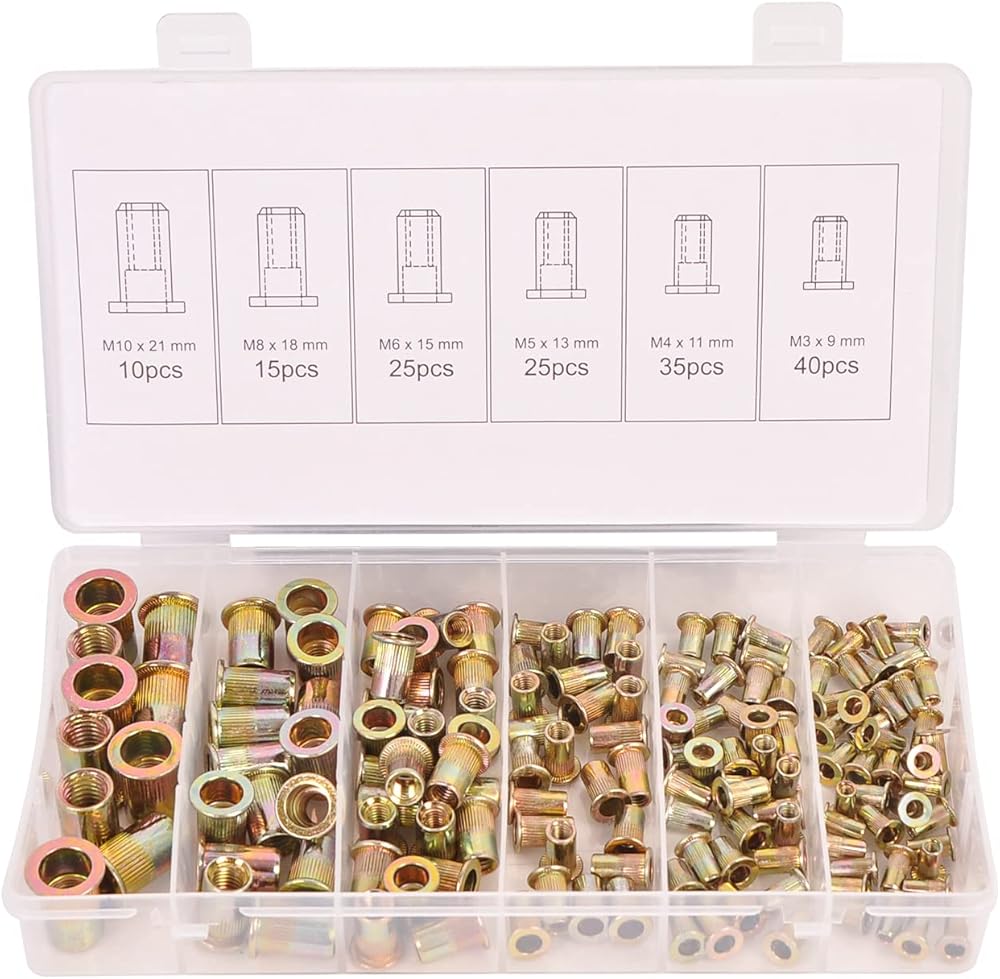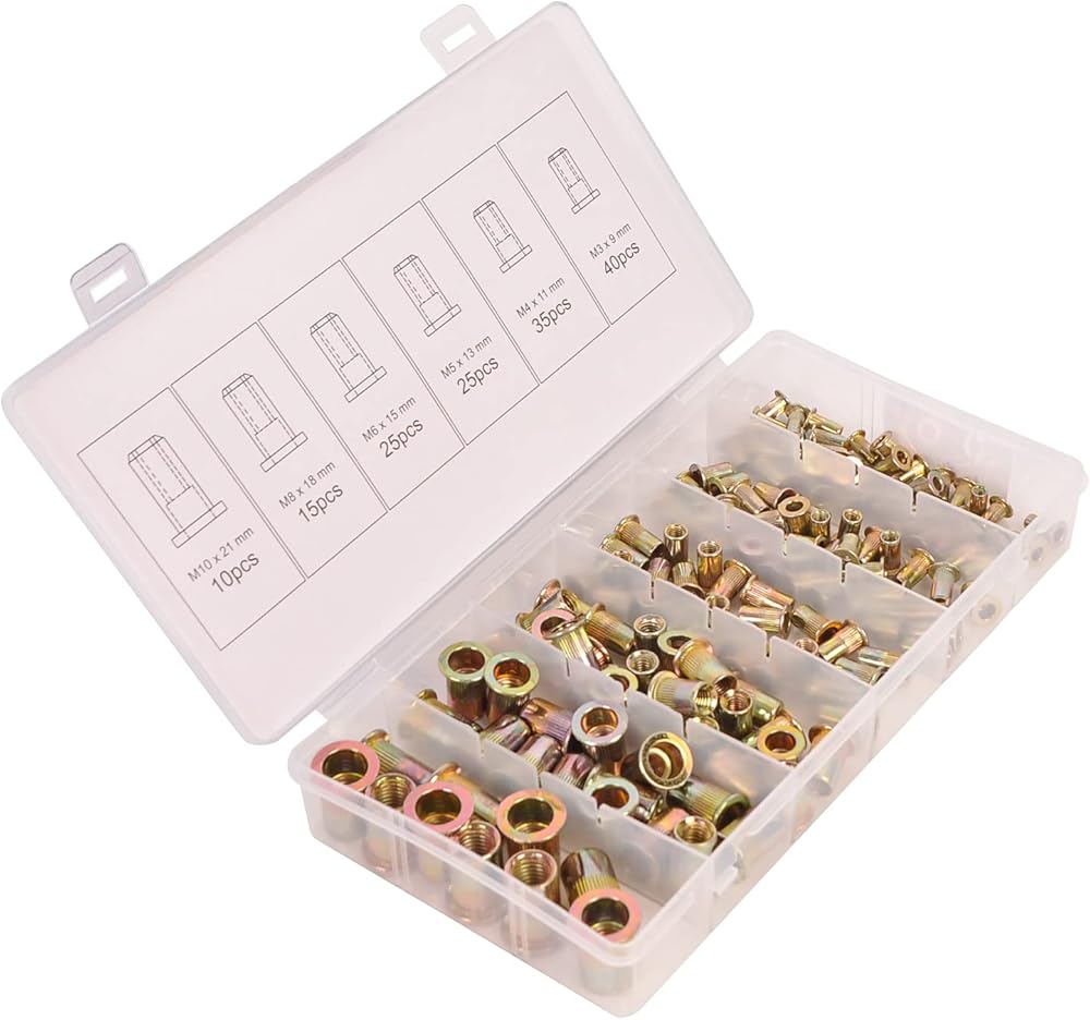 【WHAT YOU GET】150pcs rivet nuts with various sizes in a durable transparent box, it contains 5 sizes selected for you, includes:40 pcs M3 x 9 mm ,35 pcs M4 x 11 mm ,25 pcs M5 x 13 mm ,25 pcs M6 x 15 mm ,15 pcs M8 x 18 mm