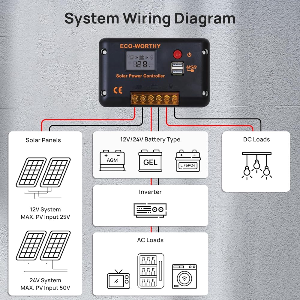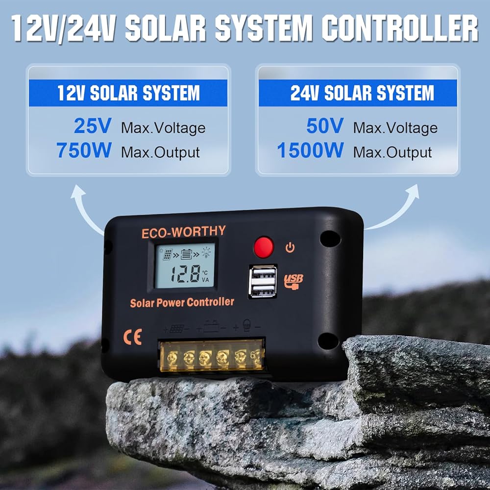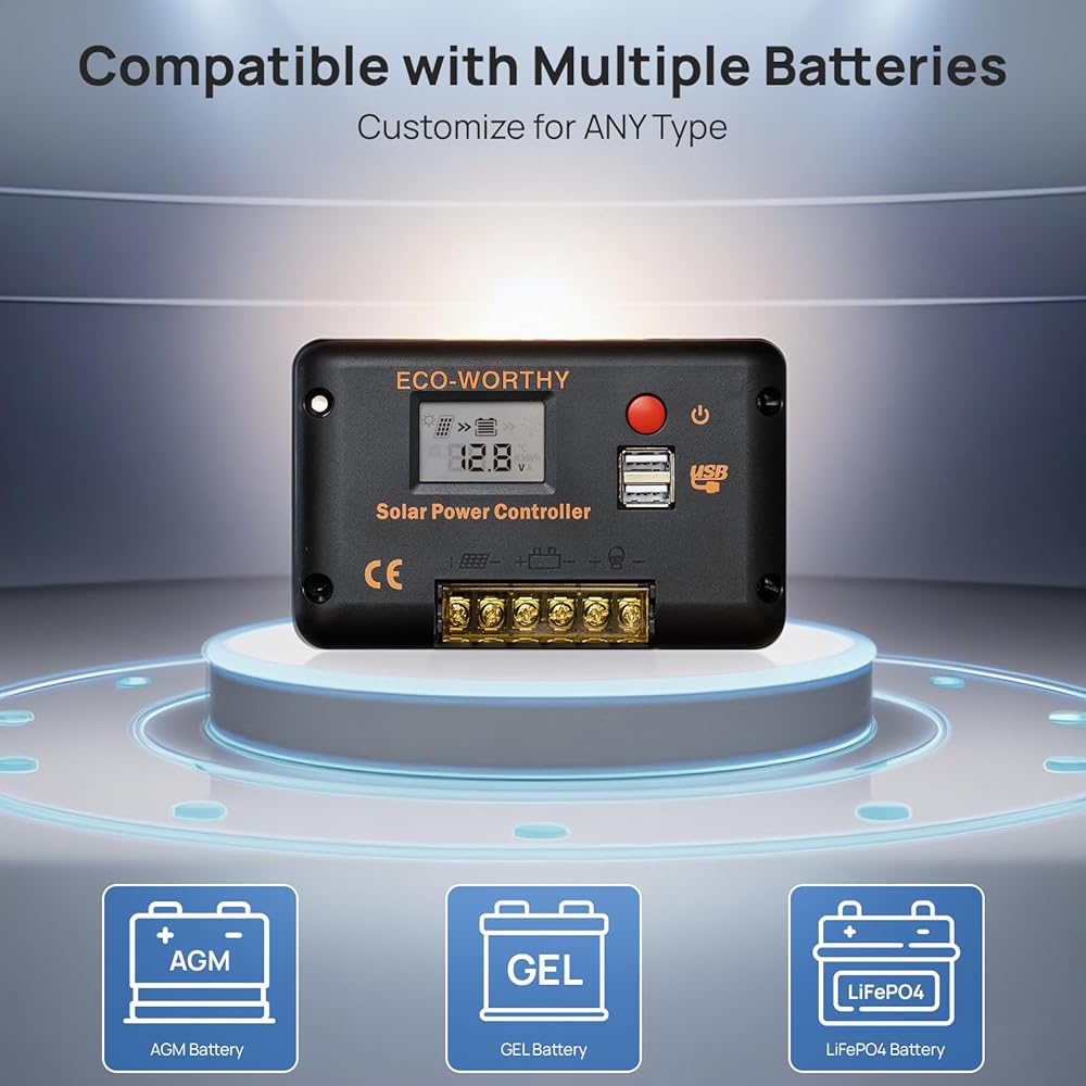 [ Multiple Protection Functions ]: ECO-WORTHY solar controller has short-circuit protection, open-circuit protection,reverse protection, over-load protection. Fully 3-stage PWM charge management, improve system efficiency and prolong the life span of the battery